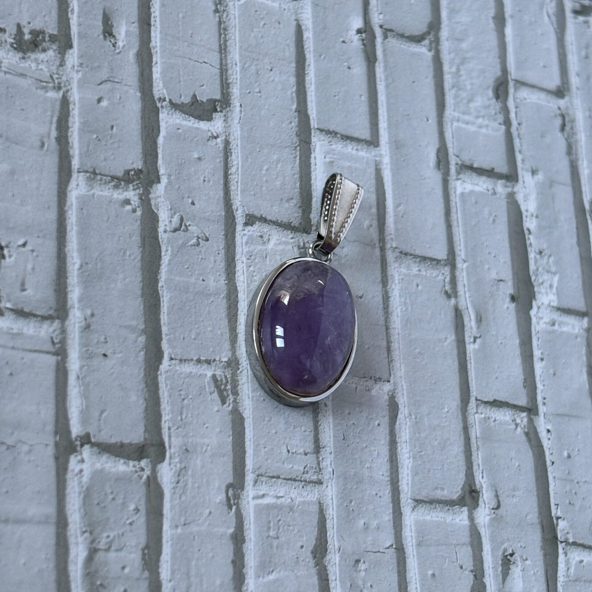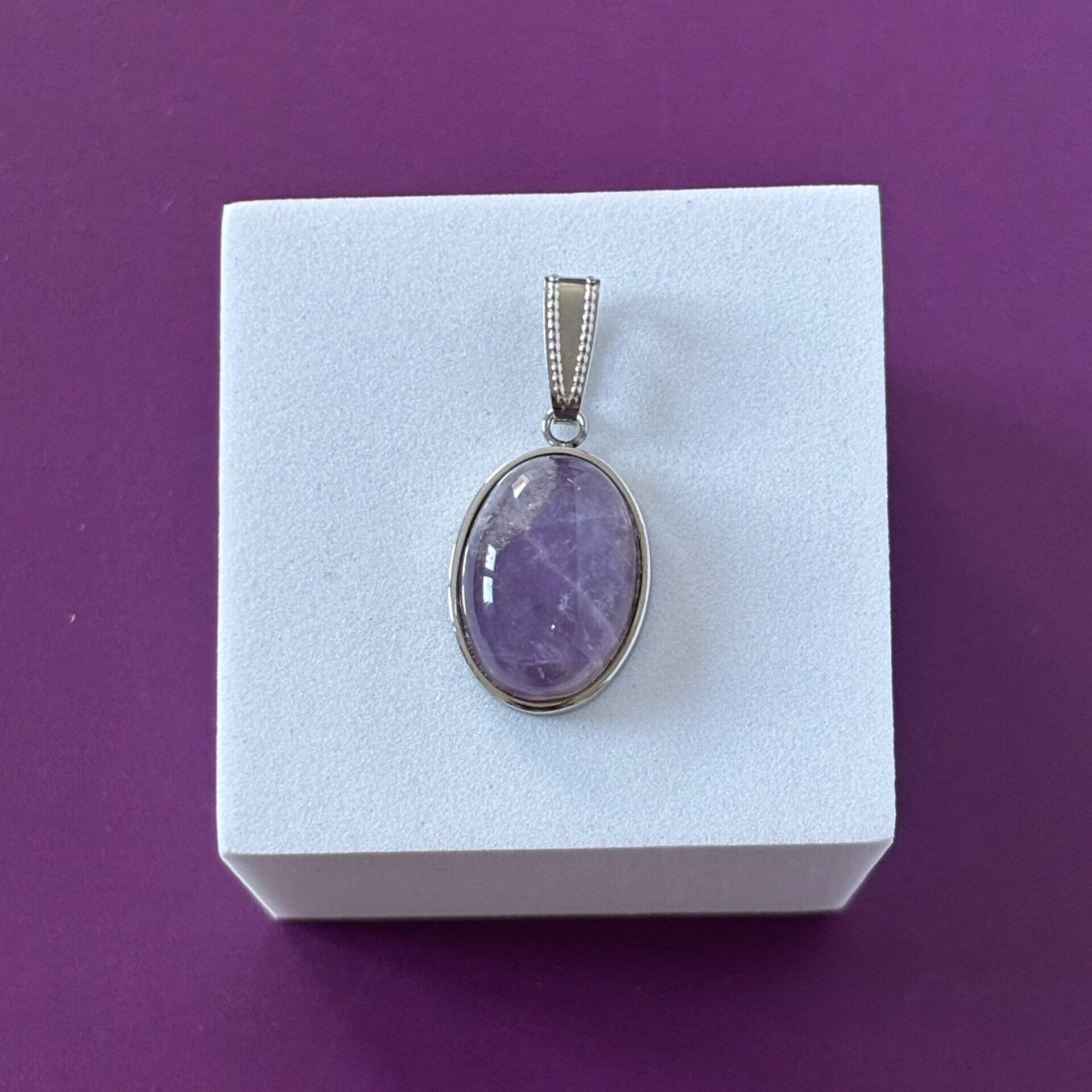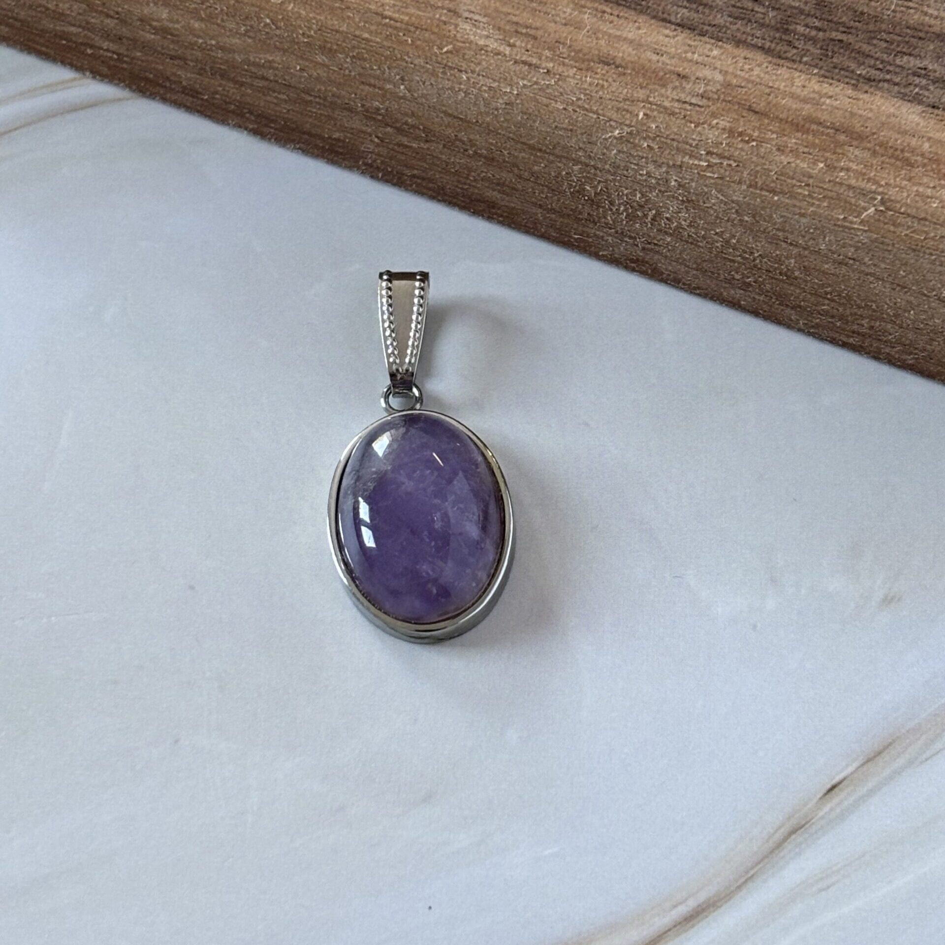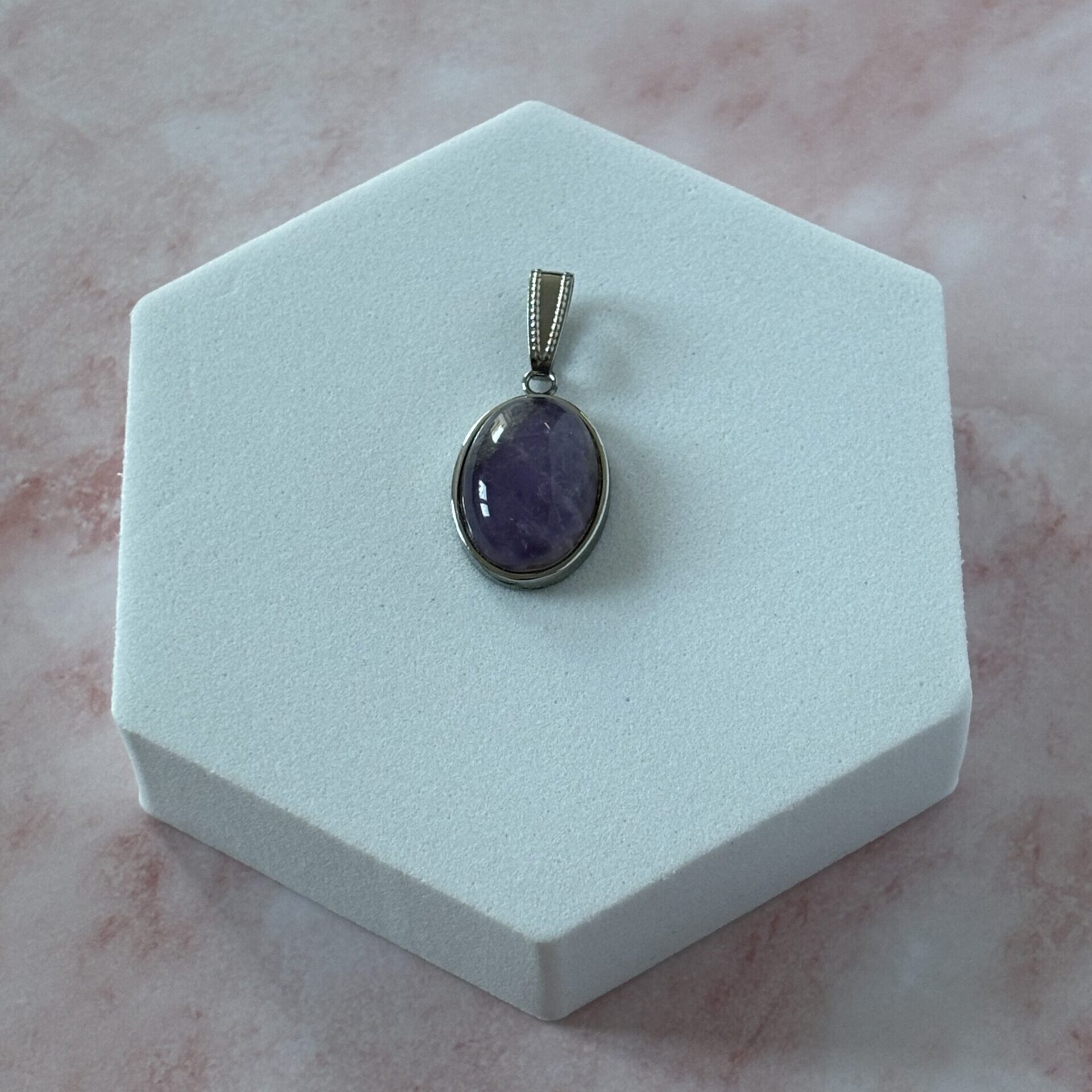 Pendentif améthyste cabochon – Cabochon ovale de 18x13mm – Support acier inoxydable – Pierre naturelle qualité ‘AA’.