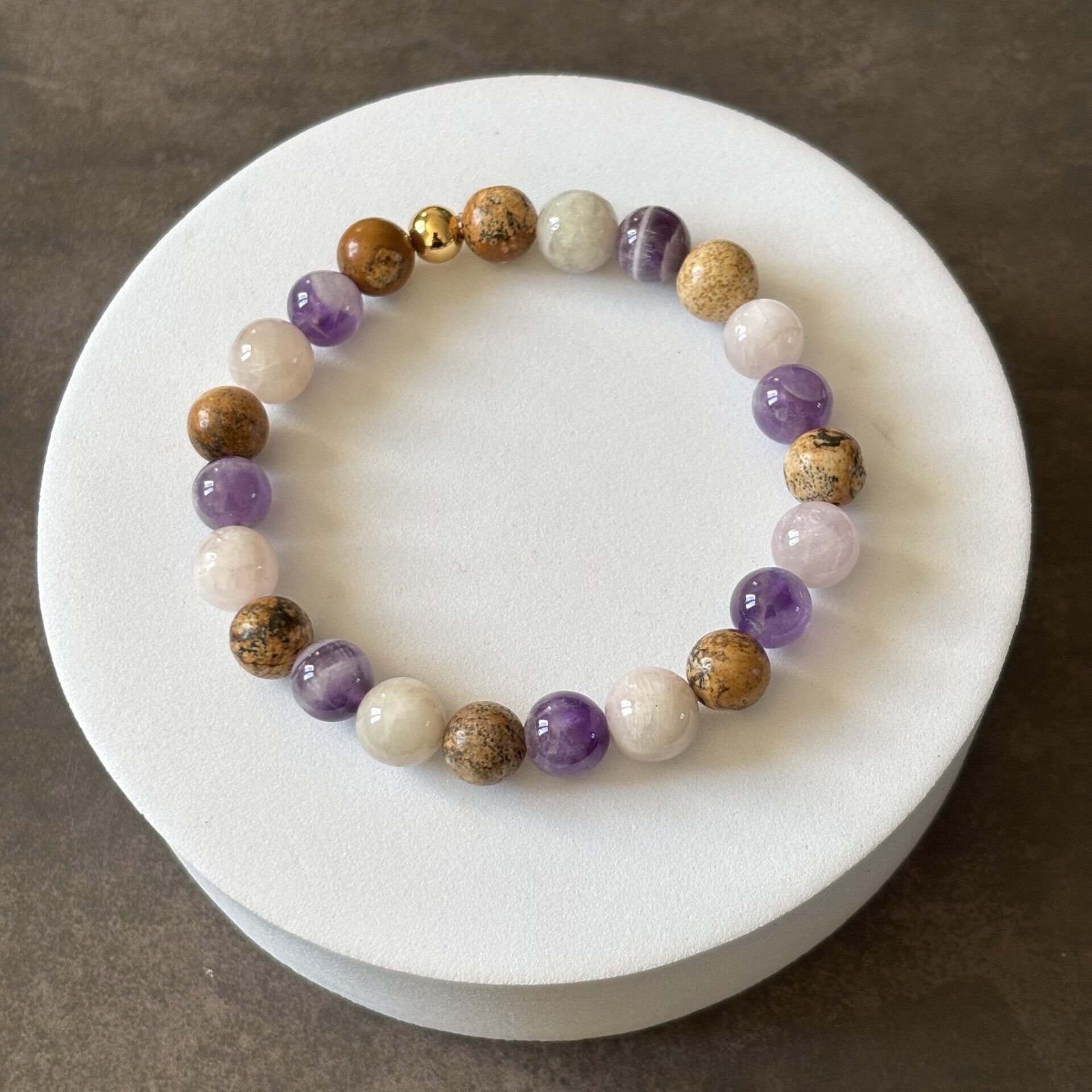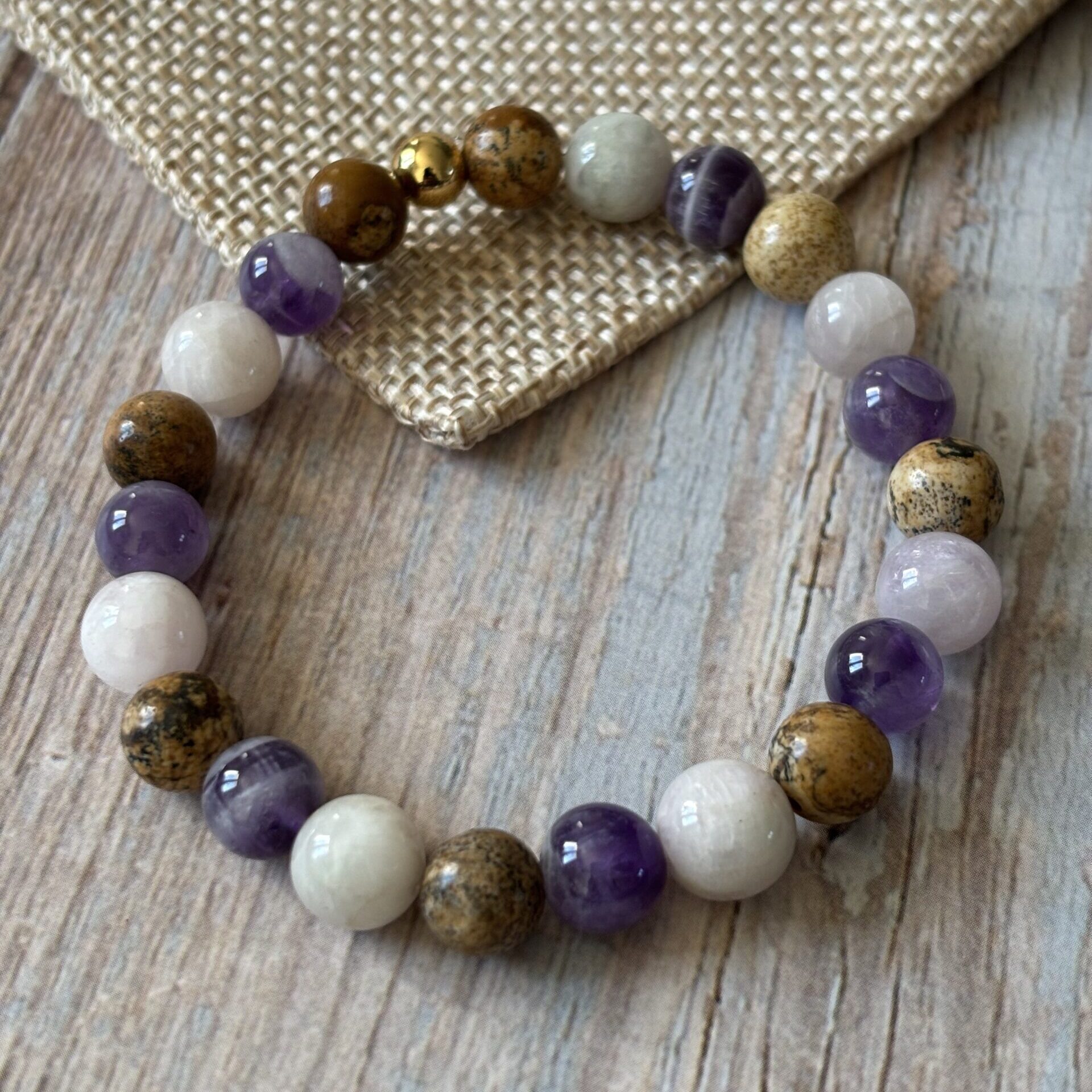 Bracelet spécifique addiction : Kunzite, améthyste chevron et jaspe paysage