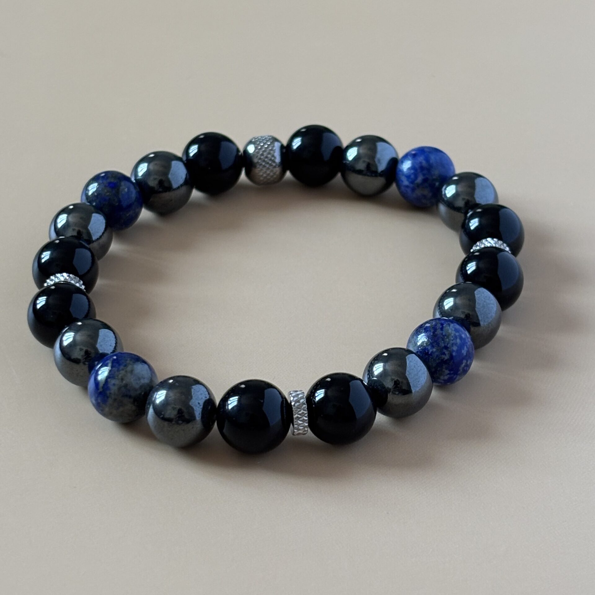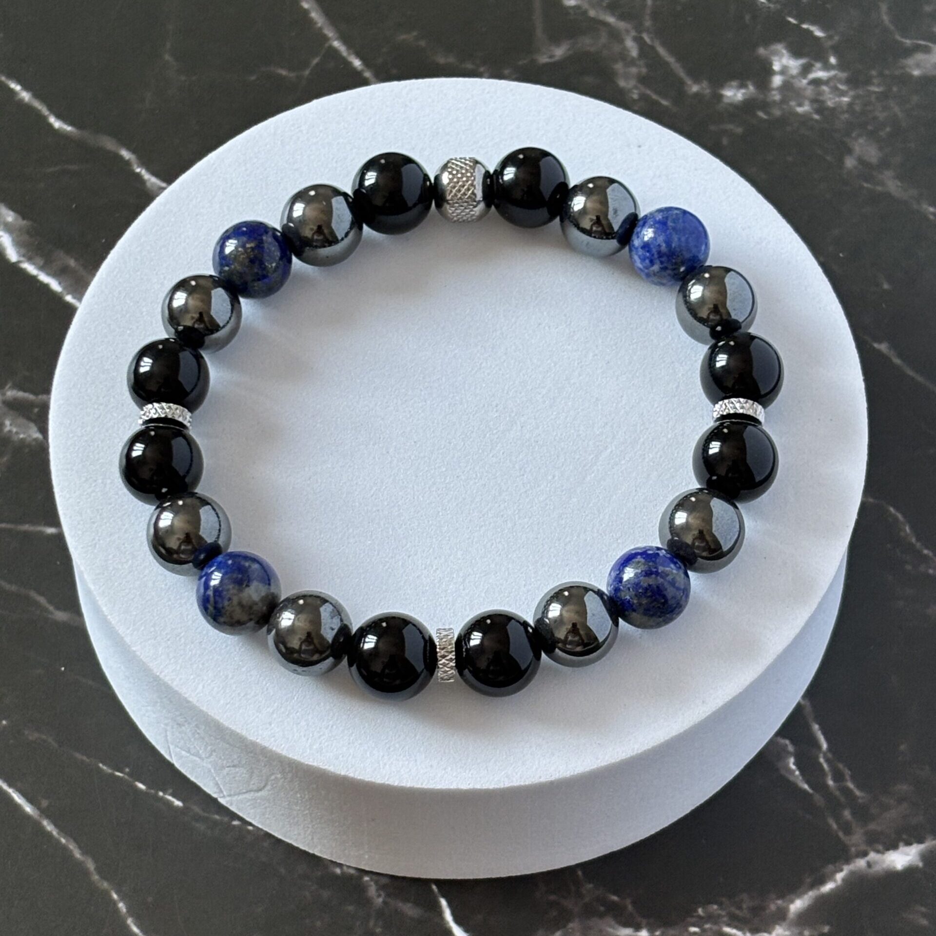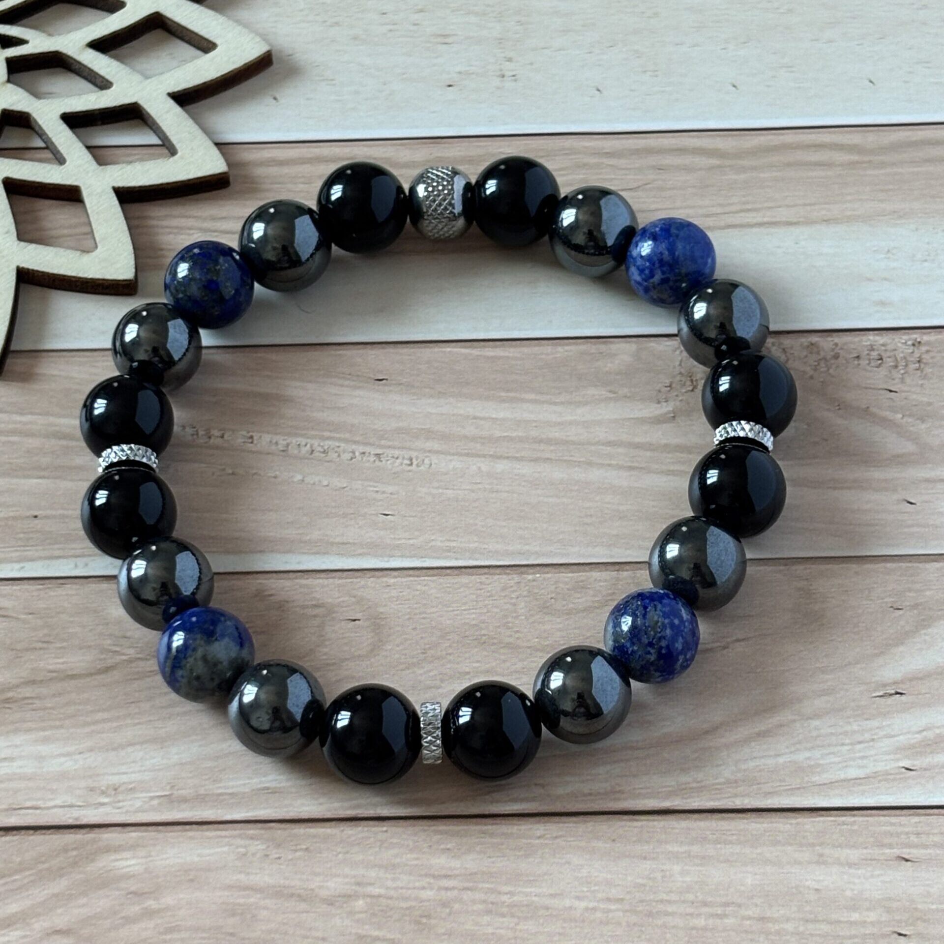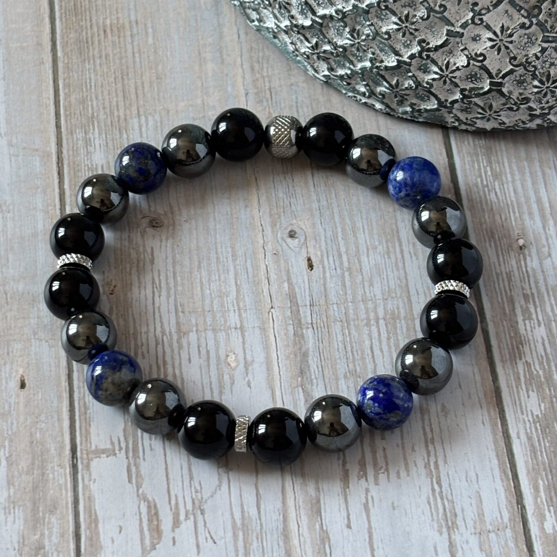 Bracelet perles Lapis lazuli, hématite et agate noire – Perles 10 mm – Pour poignet 18 cm