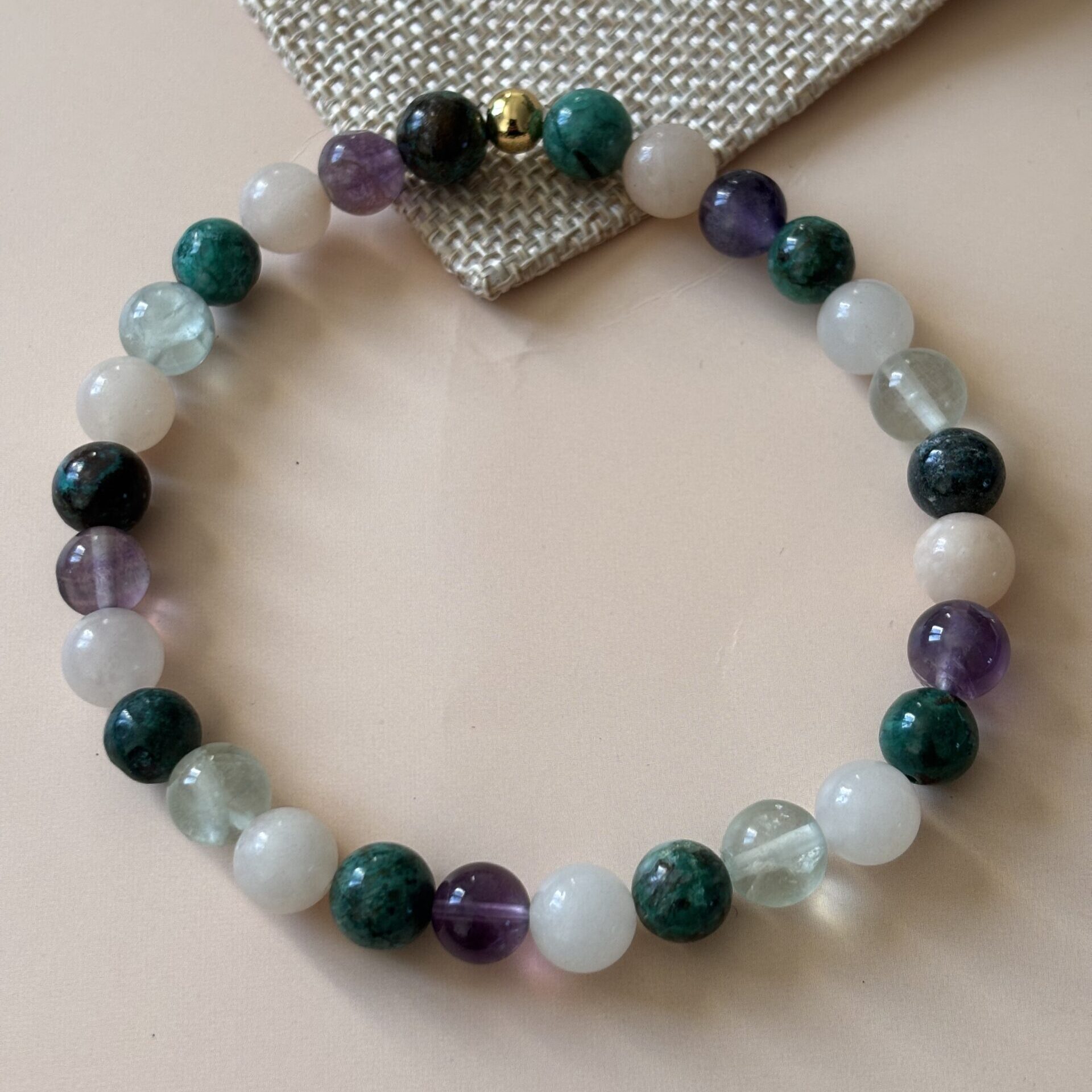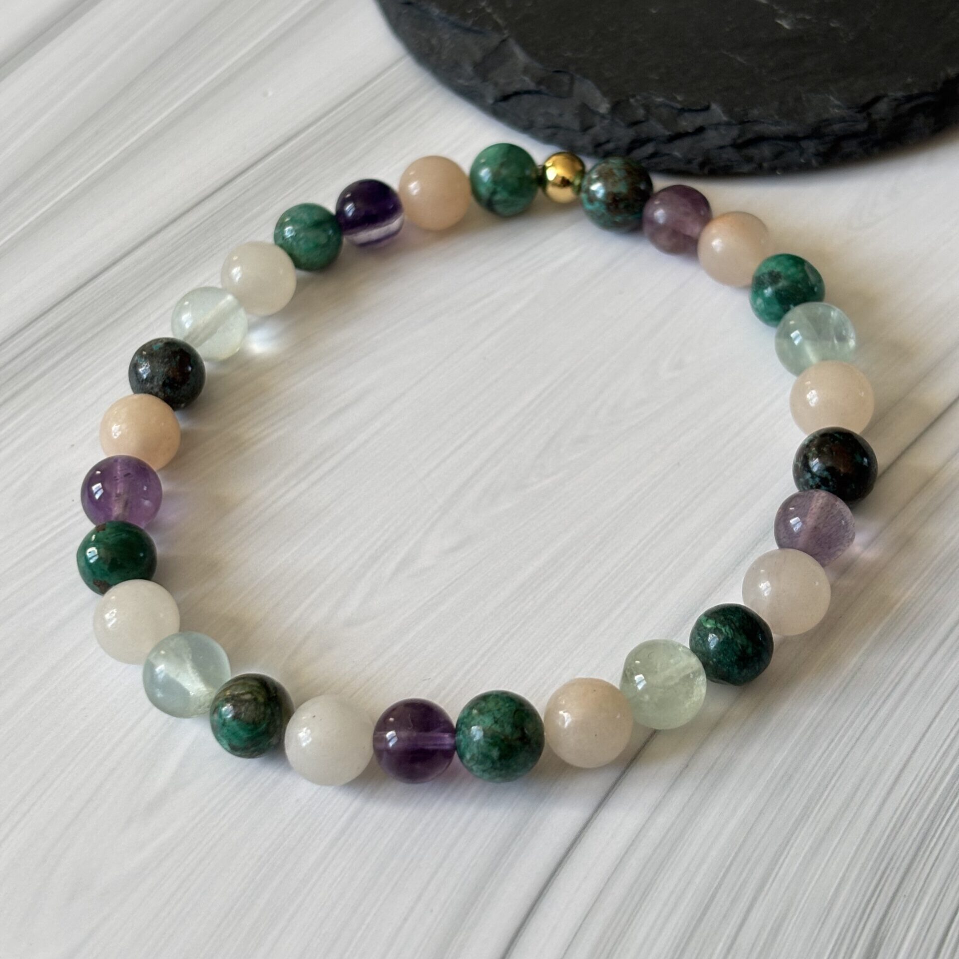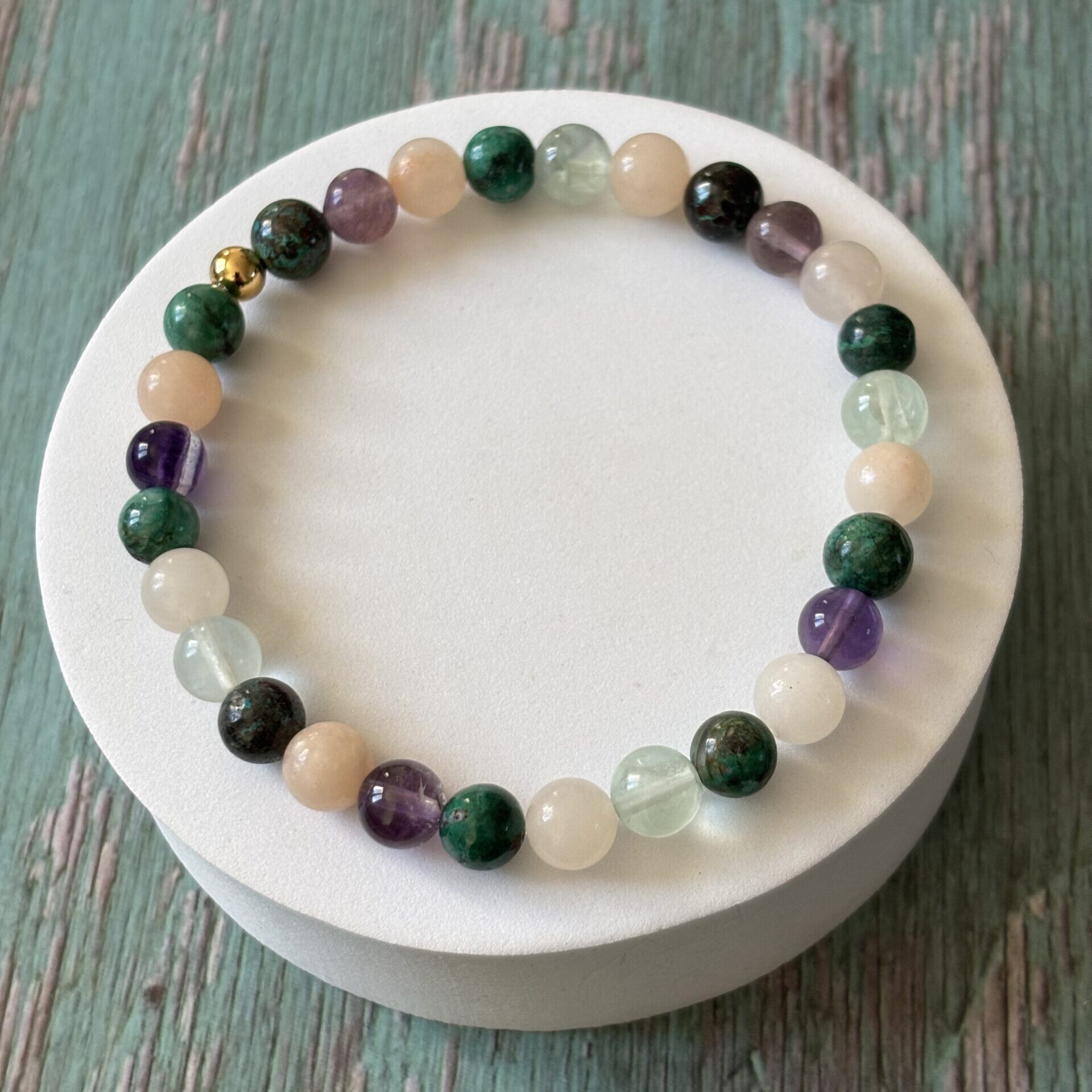 Bracelet spécifique contre l’arthrite : Chrysocolle, fluorite et calcite