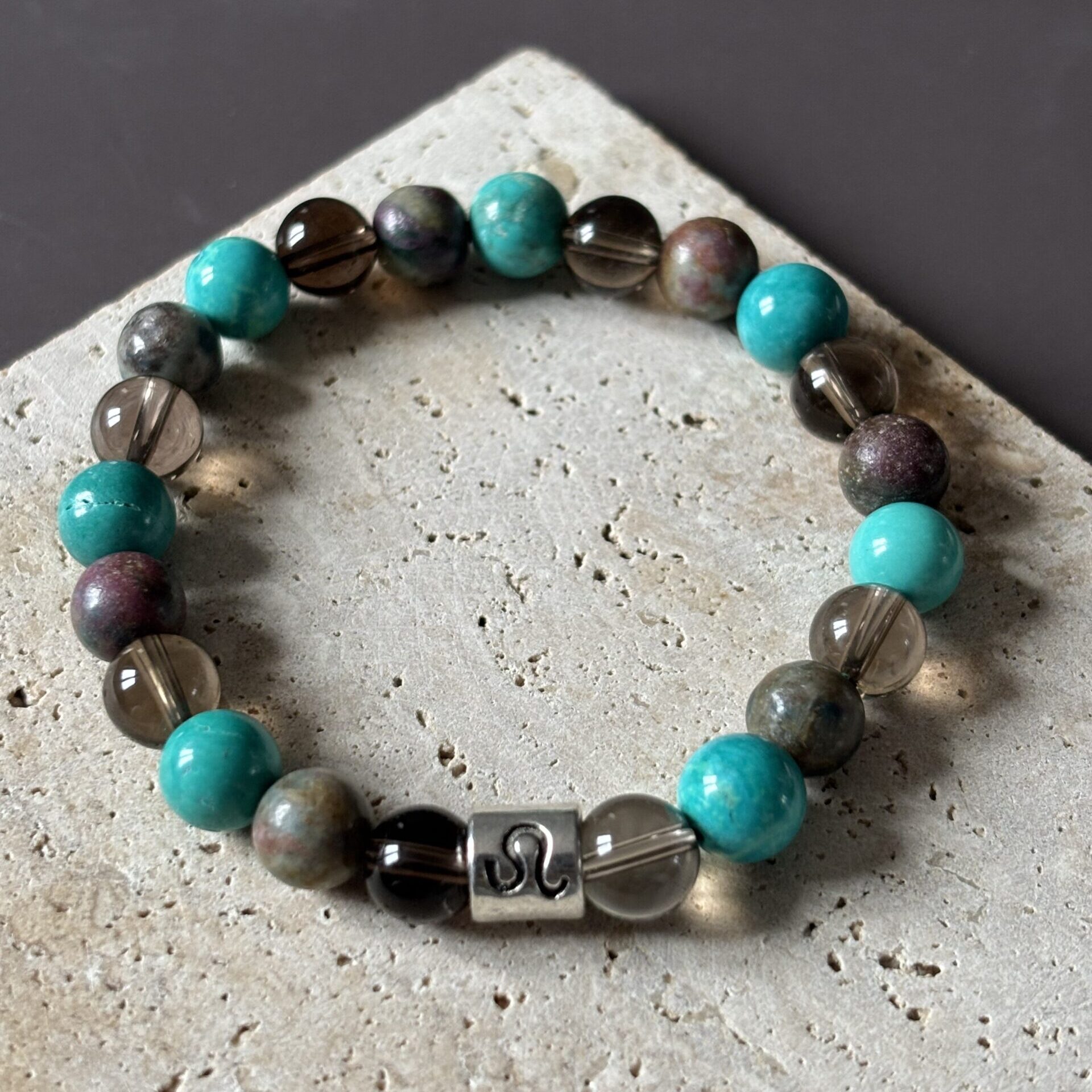 Bracelet astrologique LION – Turquoise, quartz fumé et rubis
