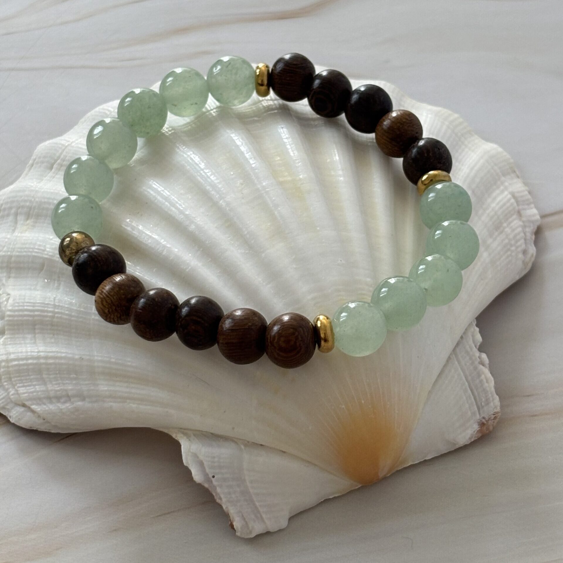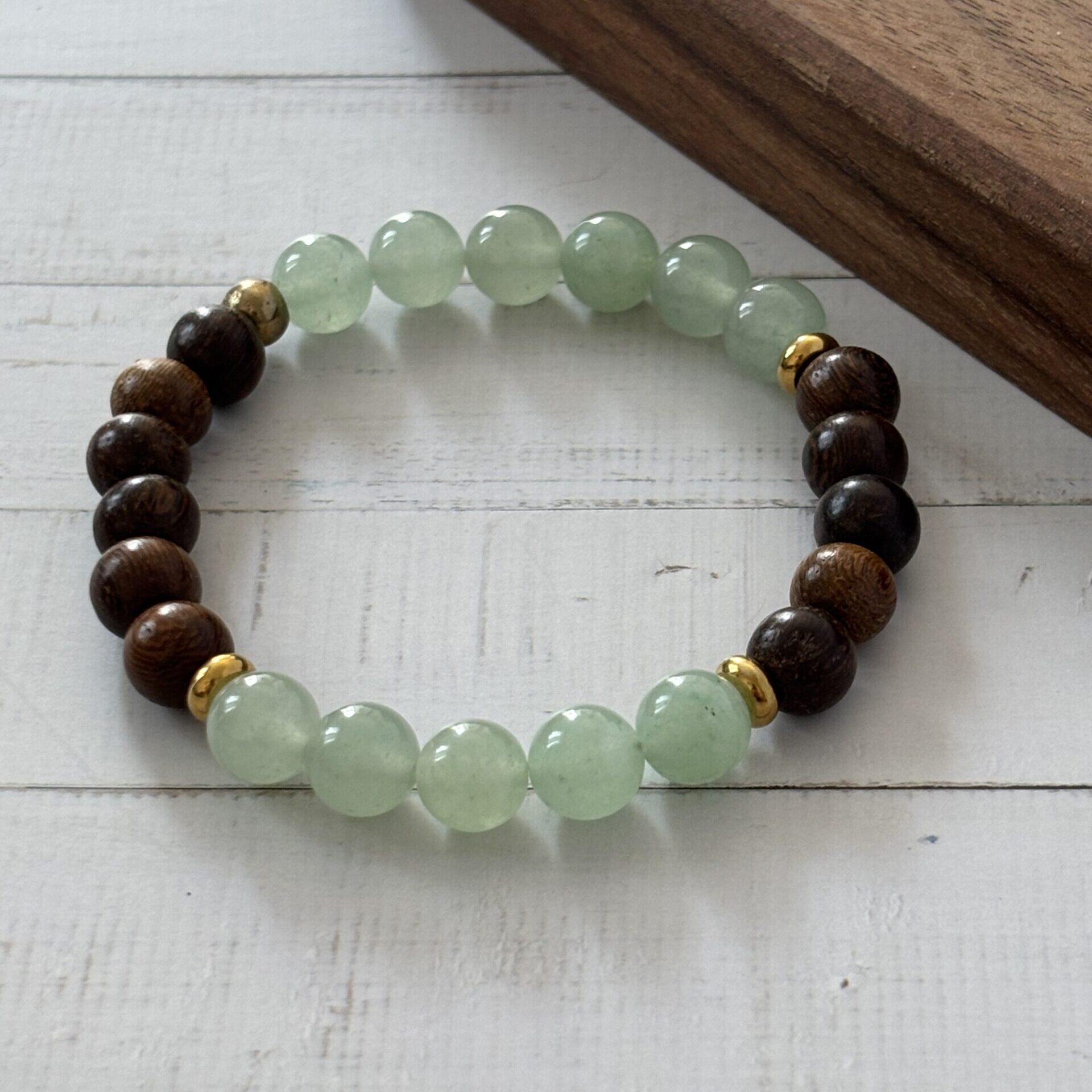 Bracelet aventurine verte et perles de bois de Roble – Perles 8 mm et séparateurs métal doré.