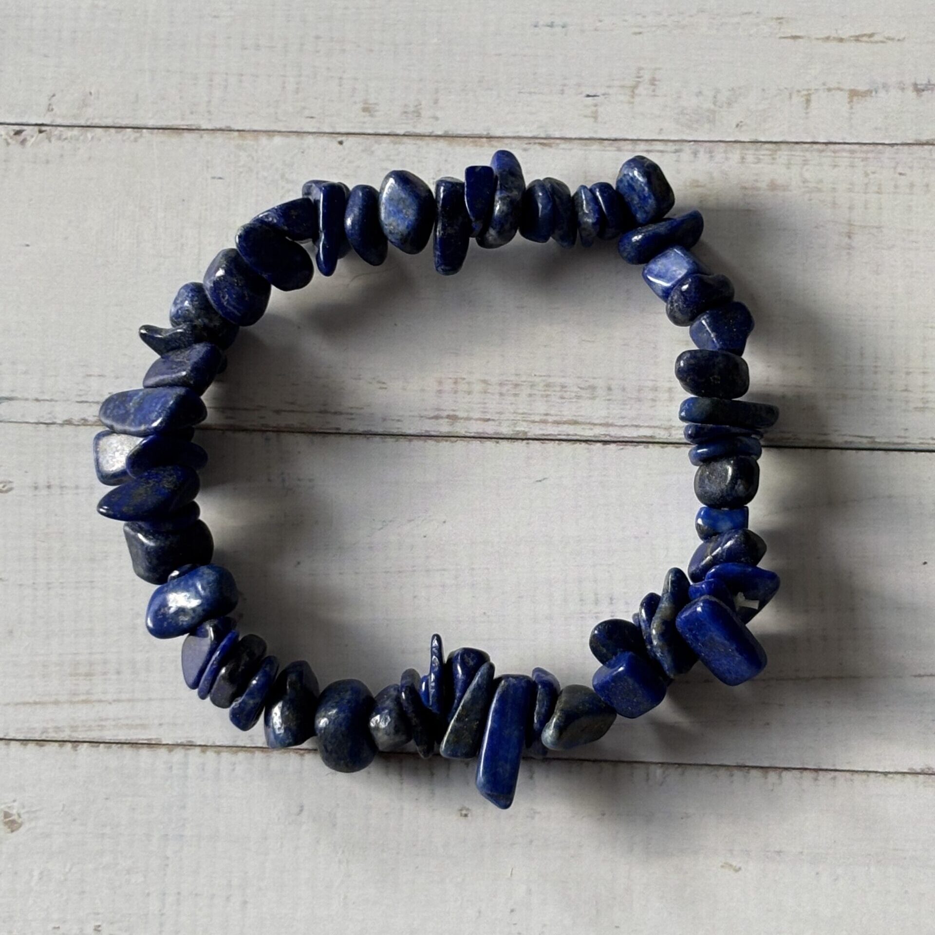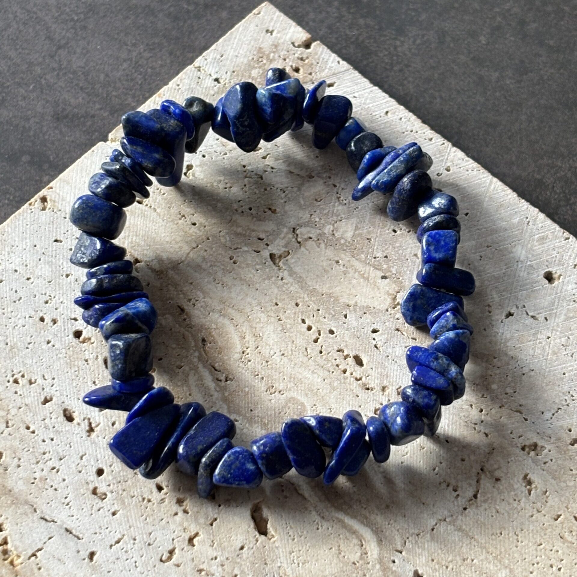 Lapis lazuli bracelet chips ou baroque composés de fragments de cristaux polis, mais aux formes irrégulières.