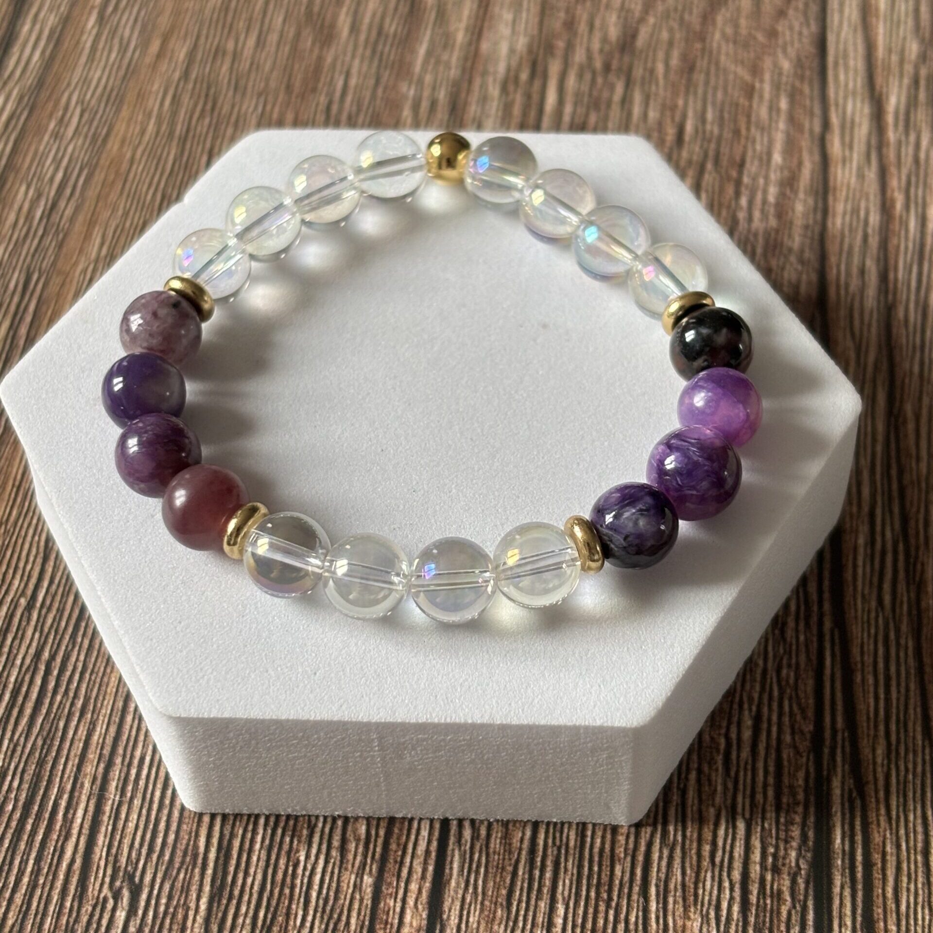 Bracelet Chakra Coronal Aqua Aura blanc et Charoïte, pour favoriser l’intuition et l’alignement spirituel.