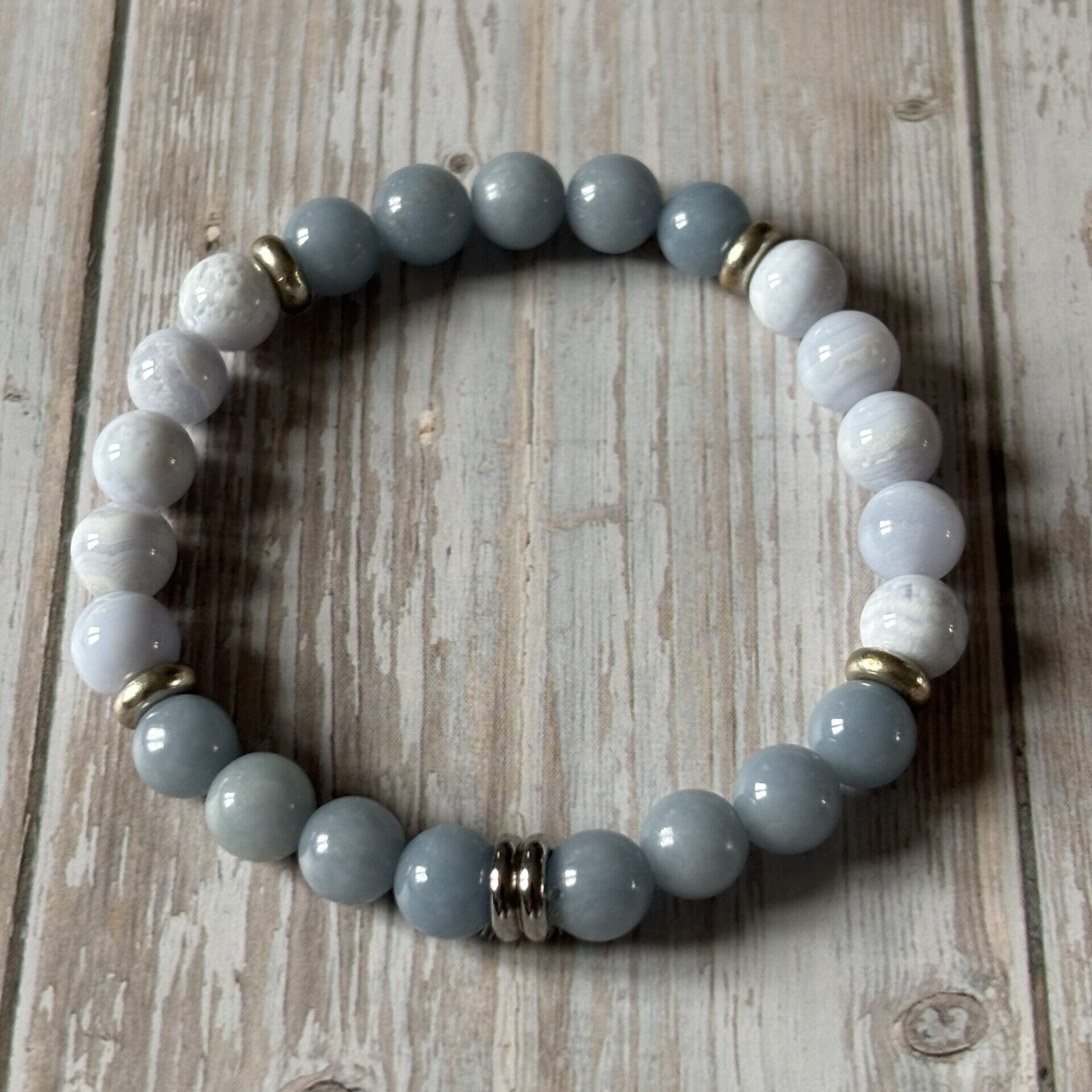 Ce bracelet Chakra Gorge associe l’Angélite et la Calcédoine pour favoriser une communication douce et authentique.