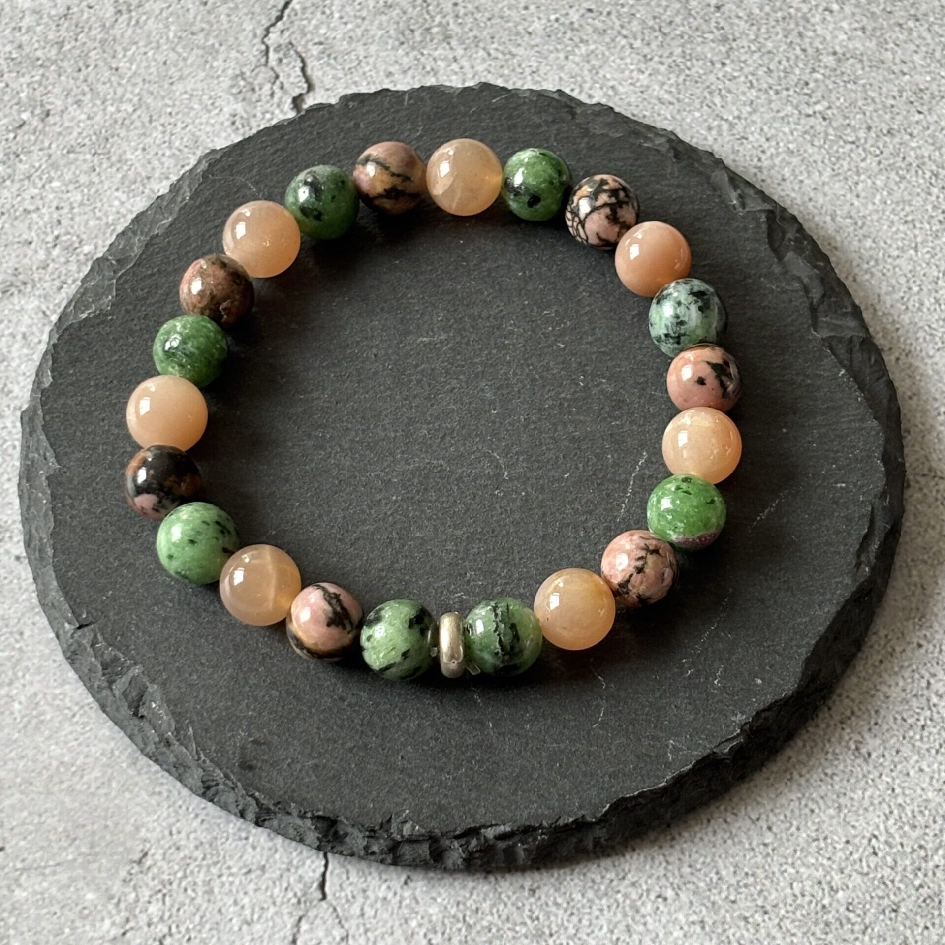 Bracelet spécifique fertilité : Pierre de lune, rhodonite et rubis zoïsite.