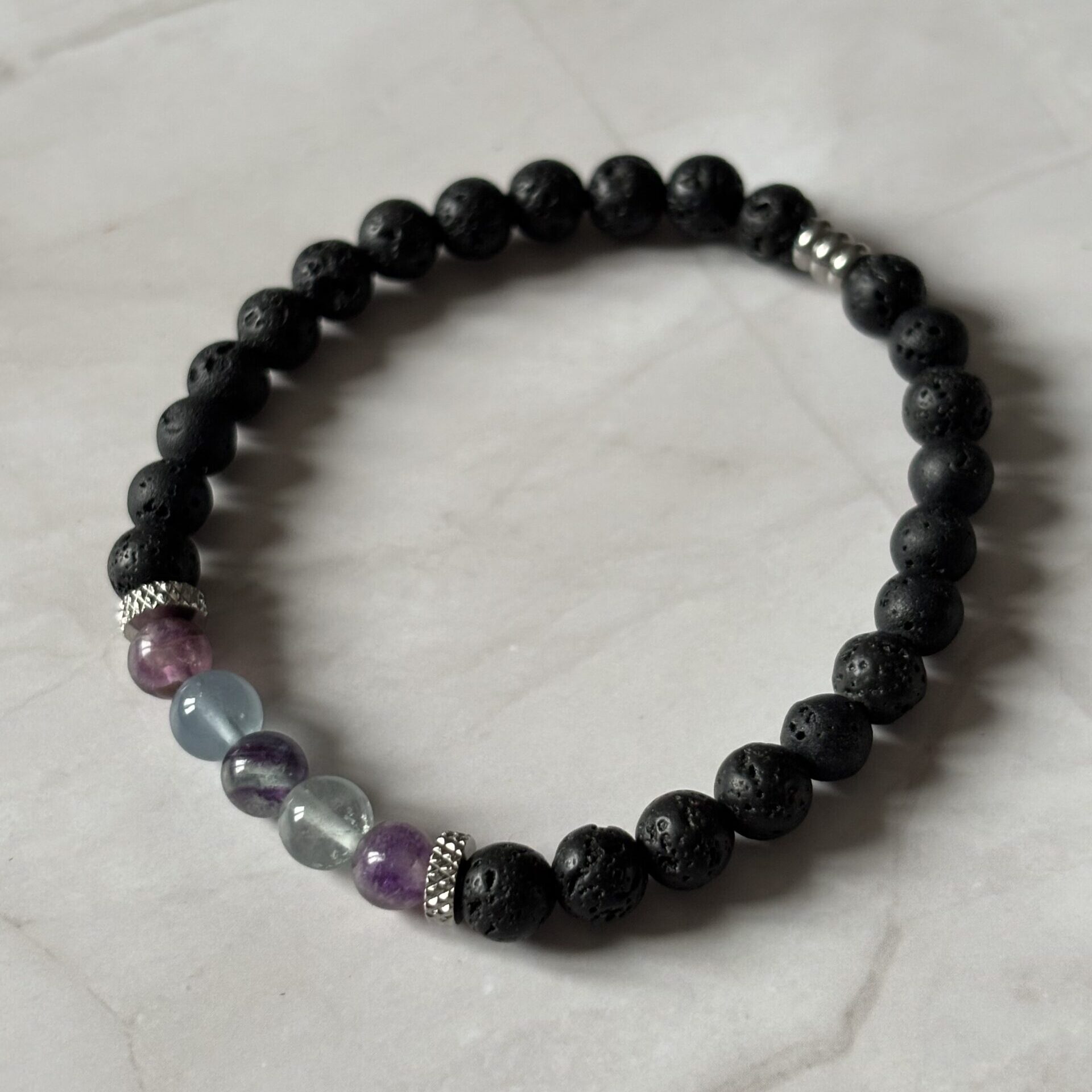 La fluorite et la pierre de lave, accompagnées des huiles essentielles, agissent ensemble pour rééquilibrer l’énergie du corps. Cette synergie restaure l’harmonie intérieure et soutient votre bien-être.