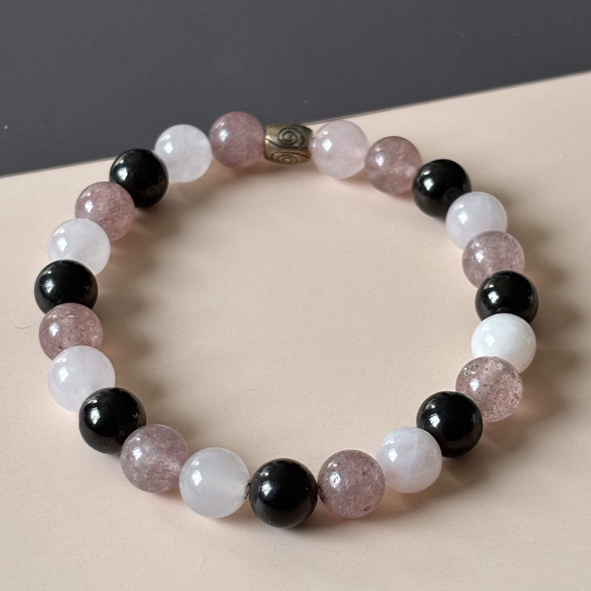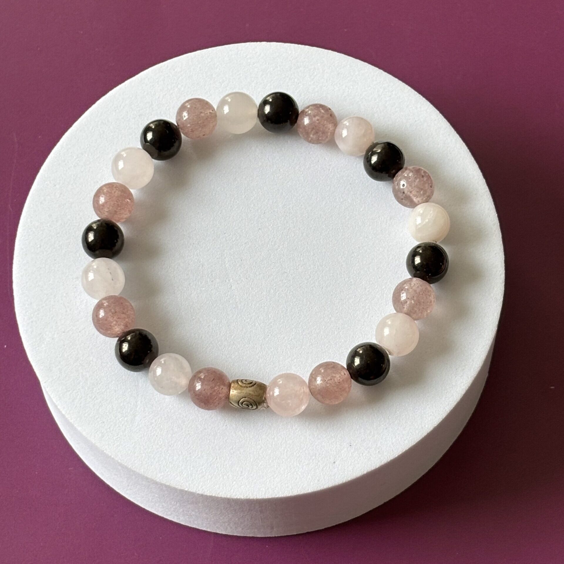 Jais, quartz fraise et quartz rose – Bracelet pour poignet de 17 cm