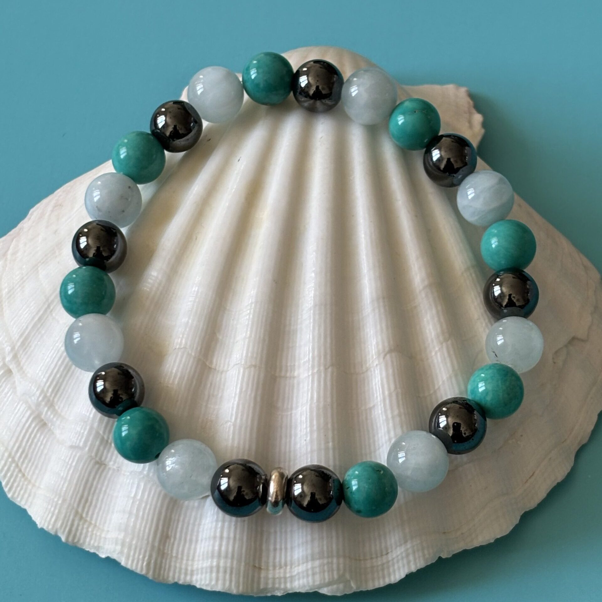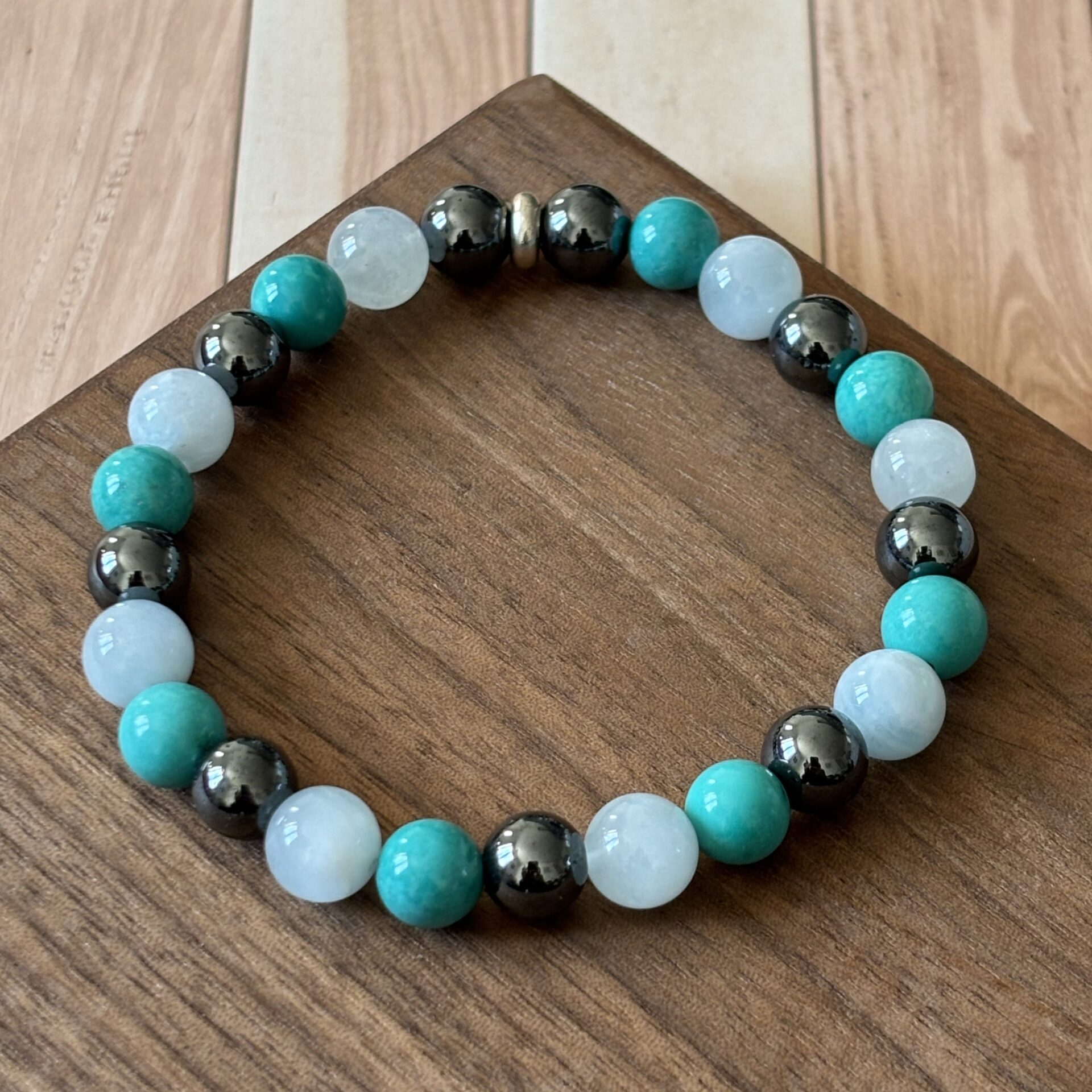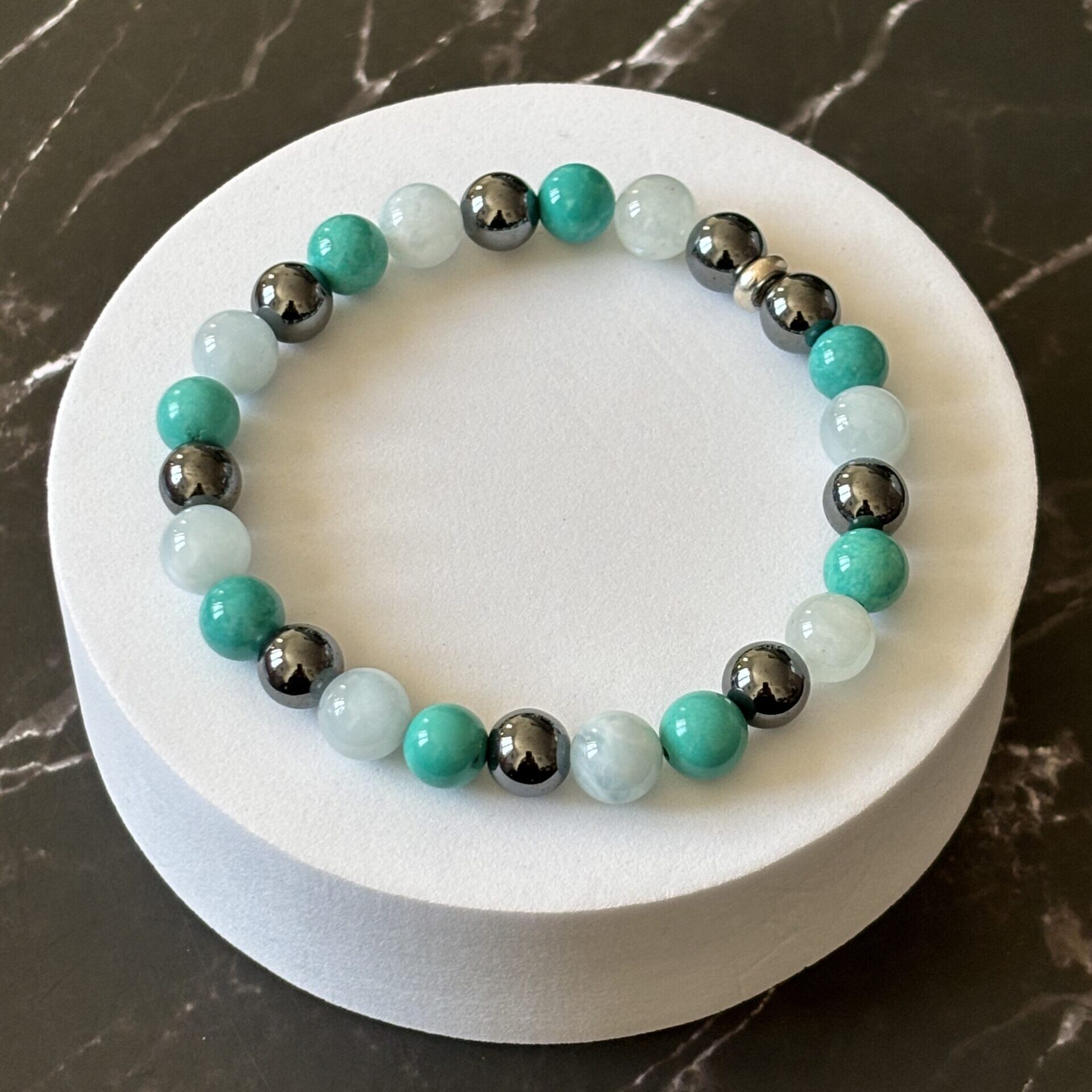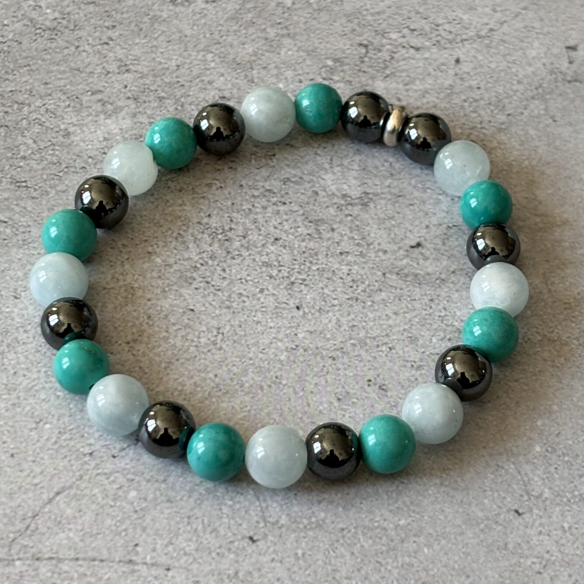 Bracelet spécifique contre le mal des transports : Hématite, aigue marine et turquoise verte stabilisée