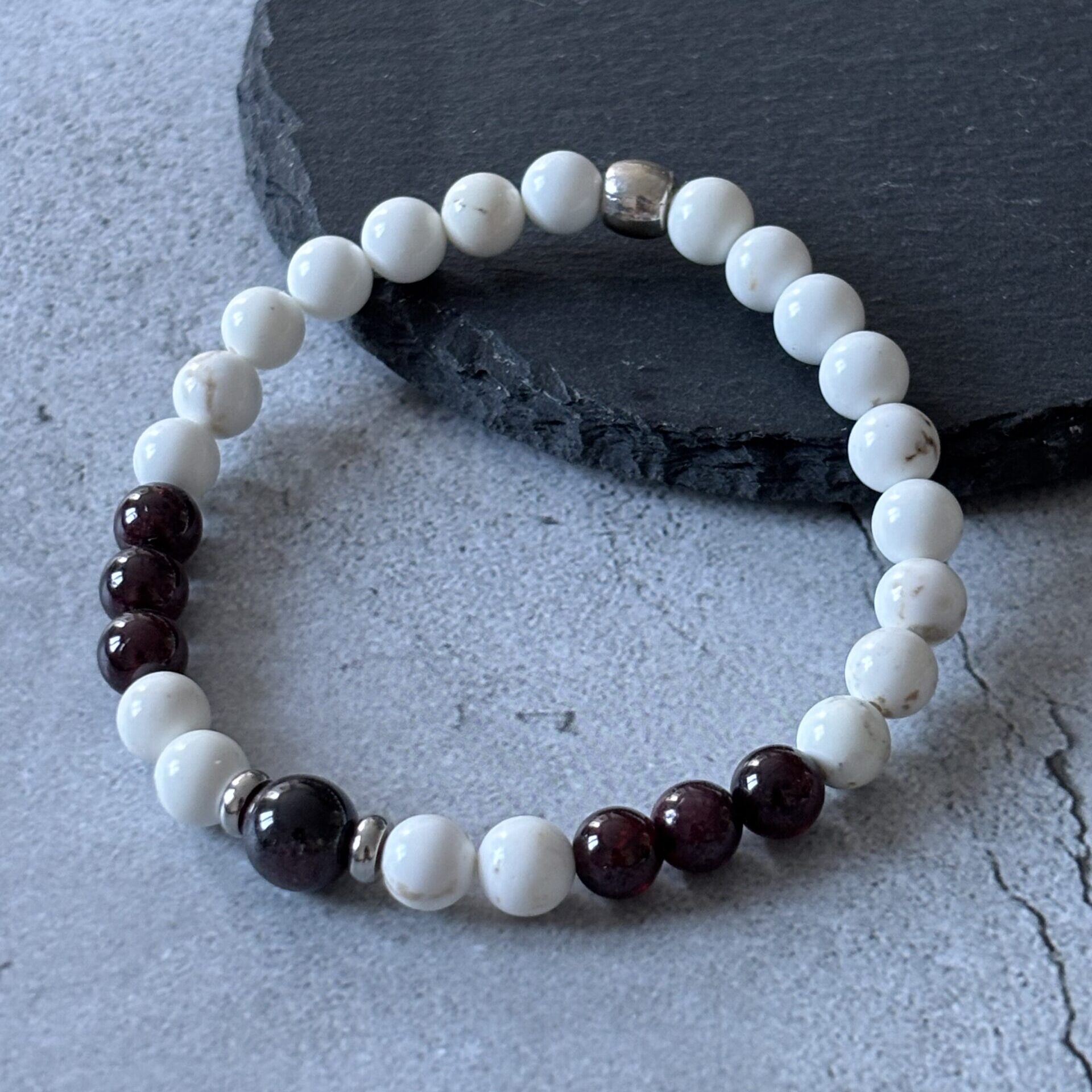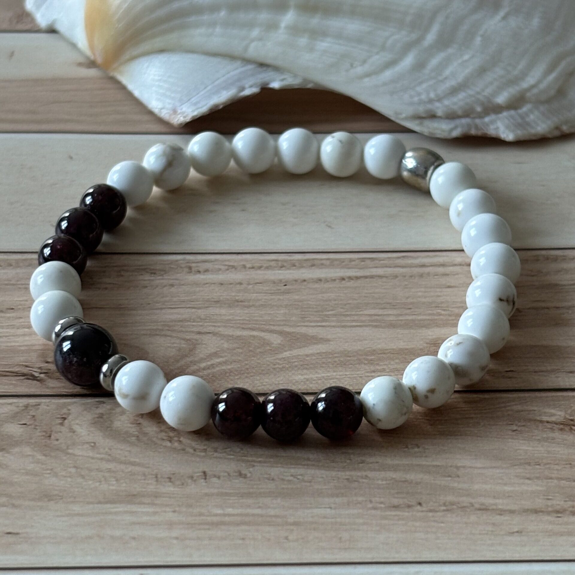 Bracelet zodiaque – Signe du Capricorne – Magnésite et grenat – Perles 6 mm et une perle de 8 mm