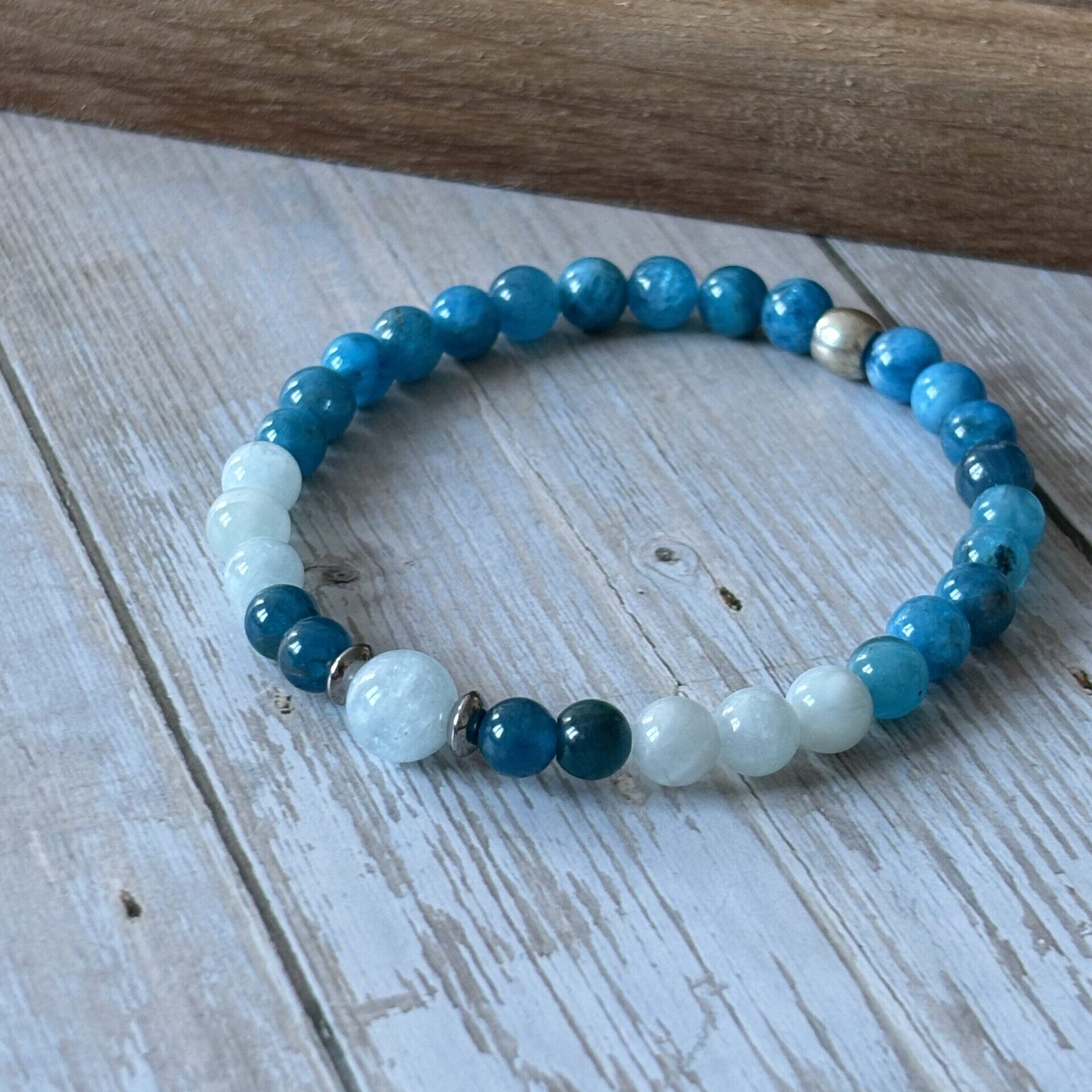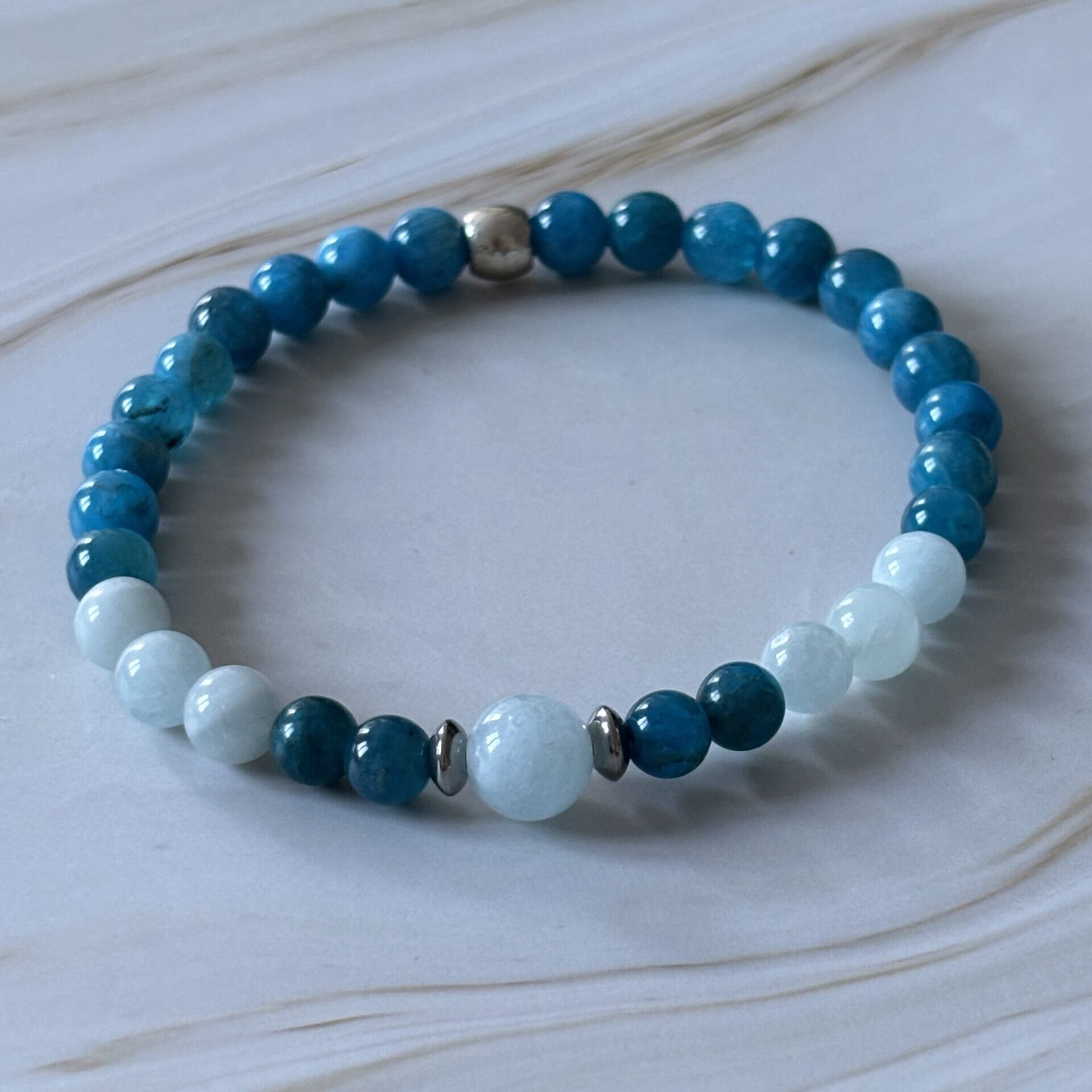 Bracelet zodiaque – Signe du Gémeaux- Apatite et aigue marine – Perles 6 mm et une perle de 8 mm