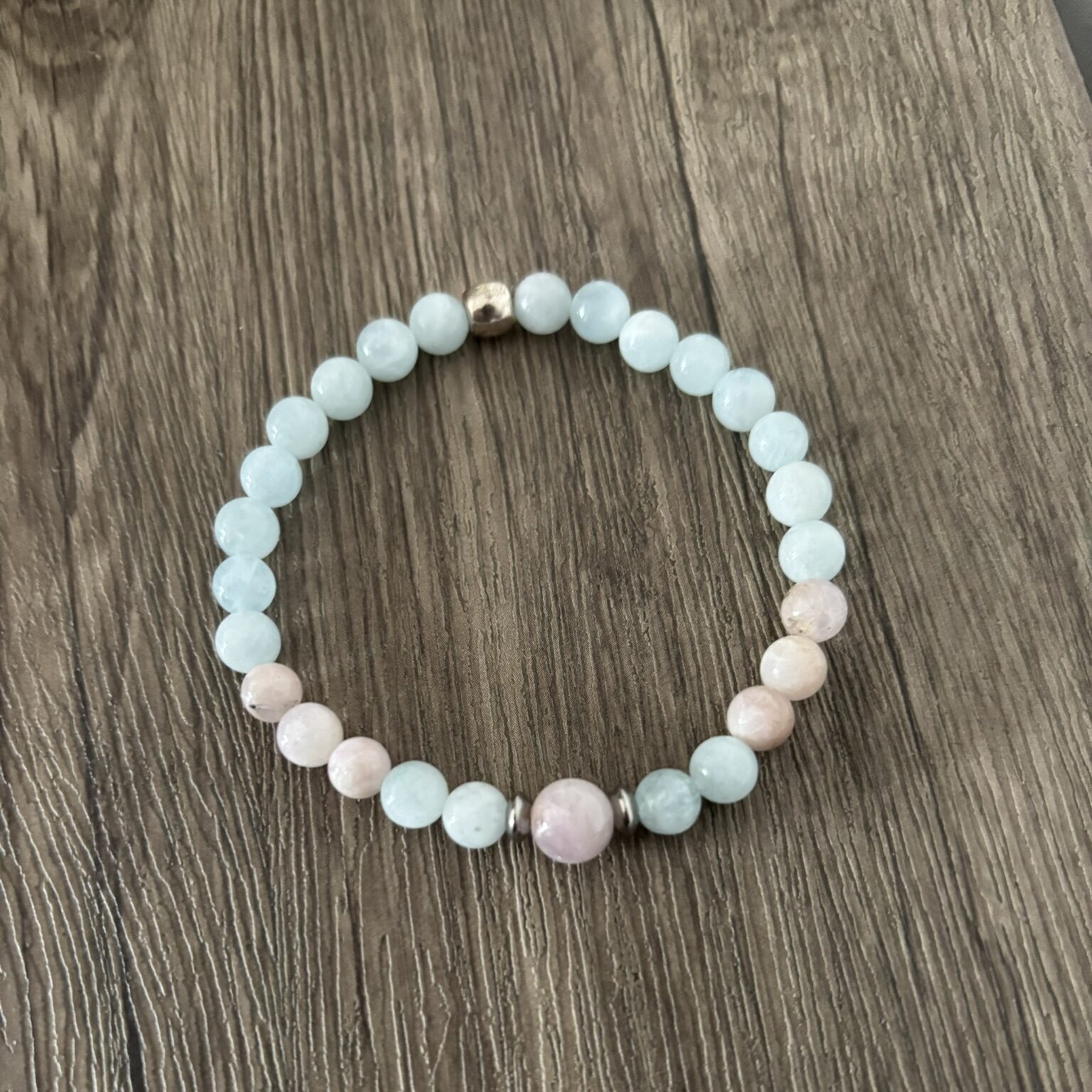 Bracelet zodiaque – Signe du Scorpion – Aigue marine et kunzite – Perles 6 mm et une perle de 8 mm