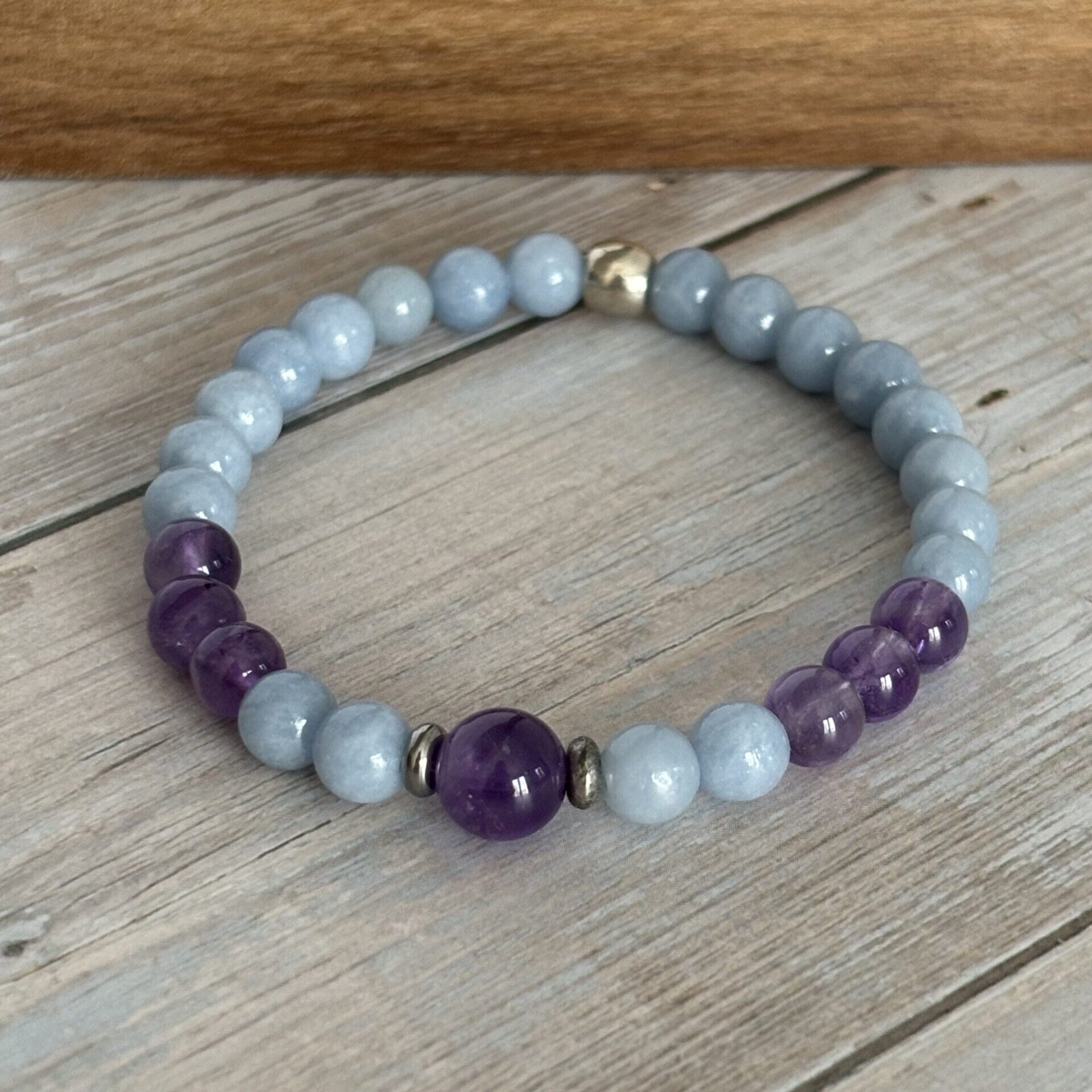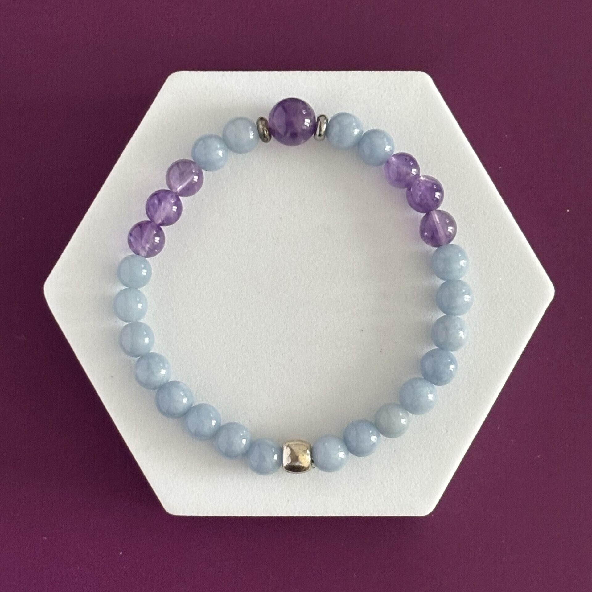 Bracelet zodiaque – Signe du Verseau – Angélite et améthyste – Perles 6 mm et une perle de 8 mm
