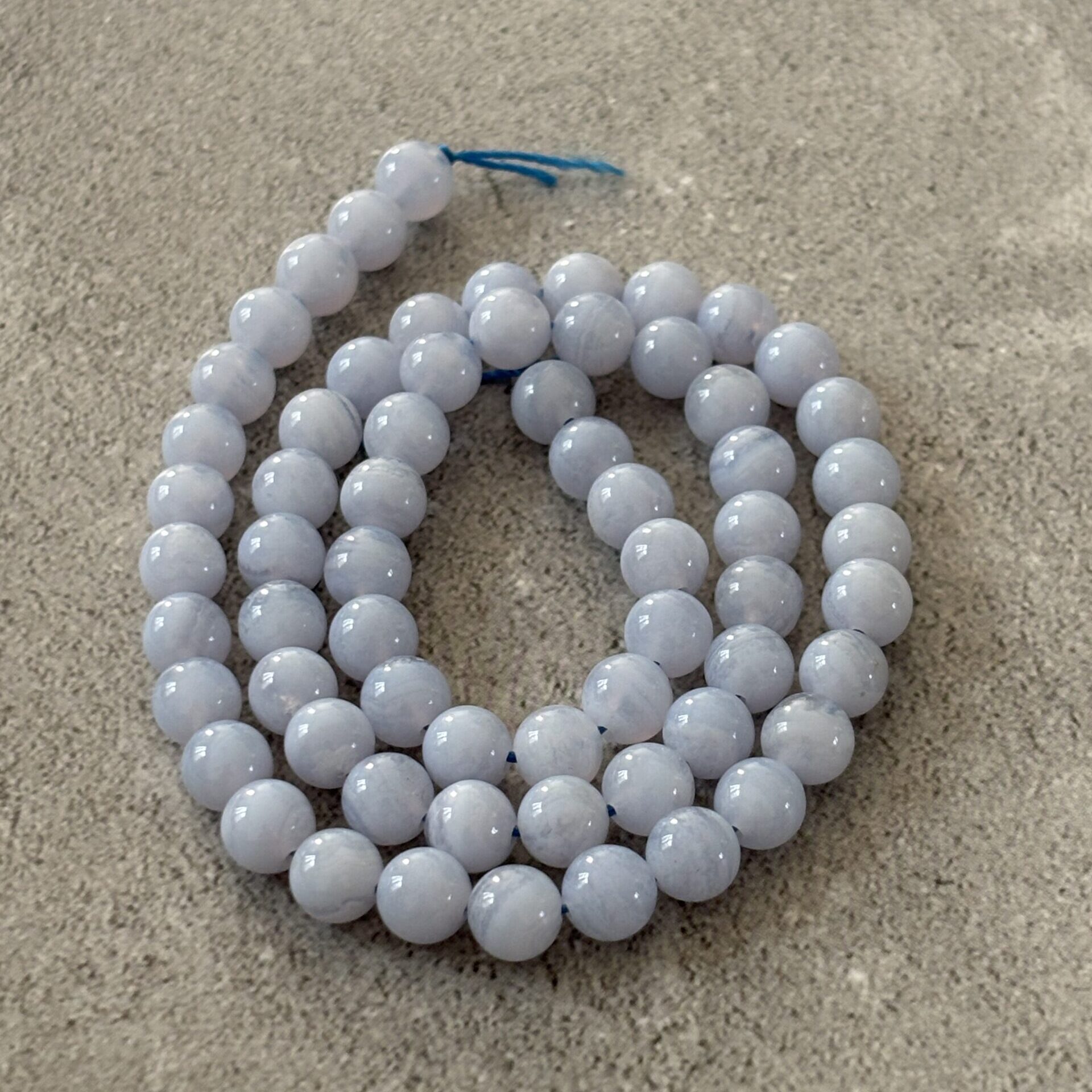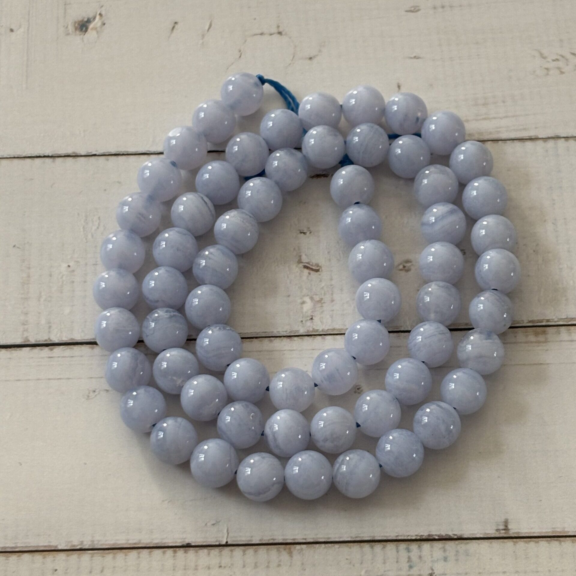 Calcédoine perles 6 mm à l’unité – Provenance Brésil – Qualité A bonne – Les fils actuels sont plus bleu transparent que blanc.