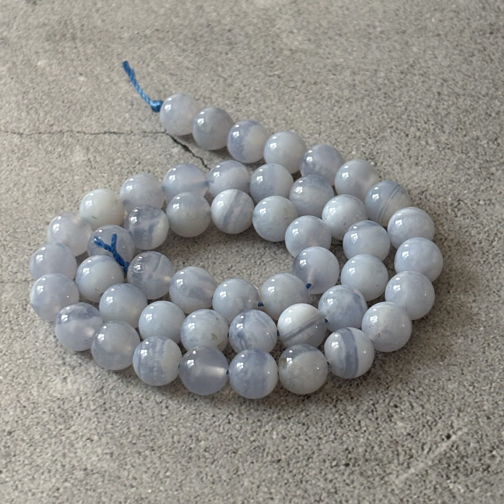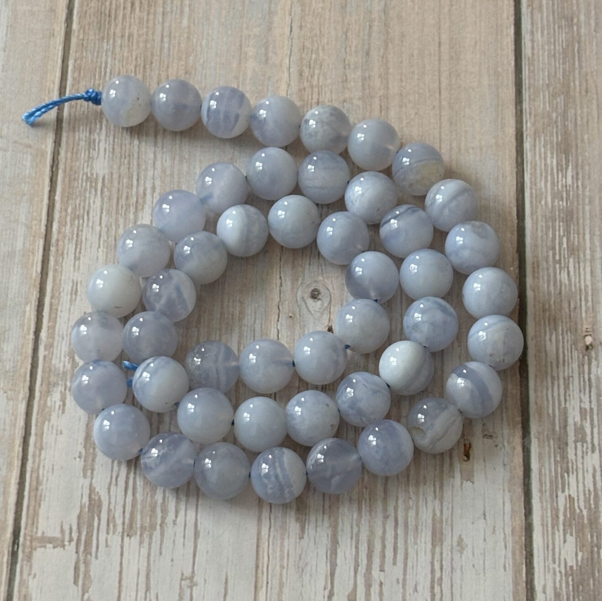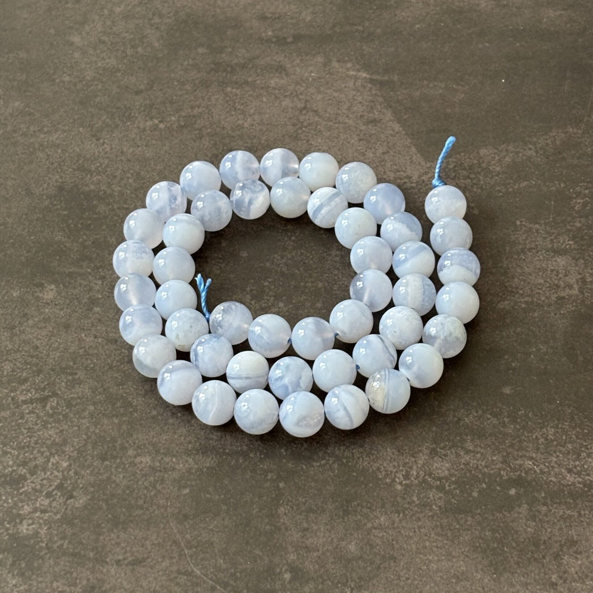 Perles Calcédoine 8 mm à l’unité – Provenance Brésil – Qualité A bonne – Les fils actuels sont plus bleu transparent que blanc.