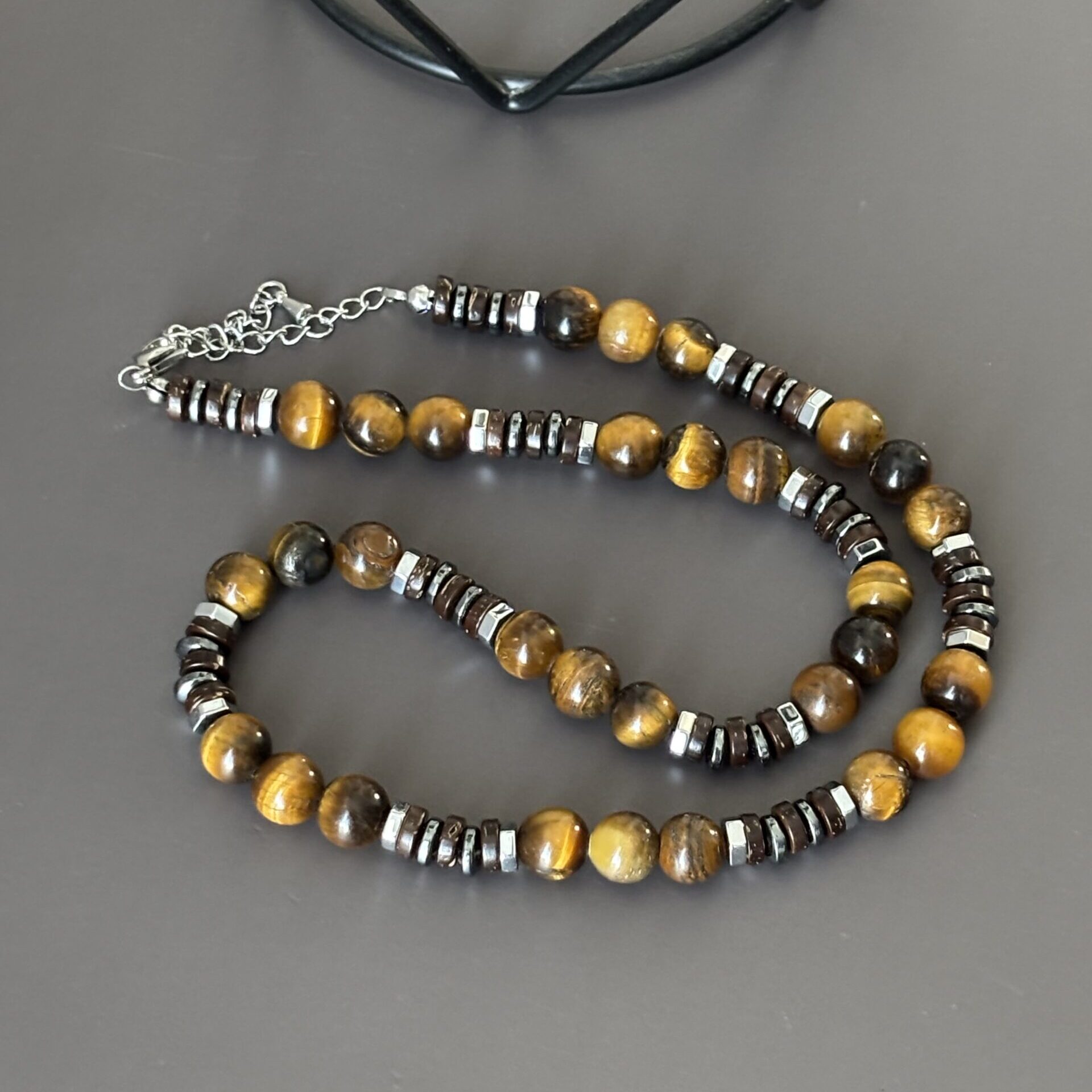 Perles 8 mm œil de tigre et rondelles hématite et bois – Longueur 42 cm et chaînette de rallonge – Métal argenté