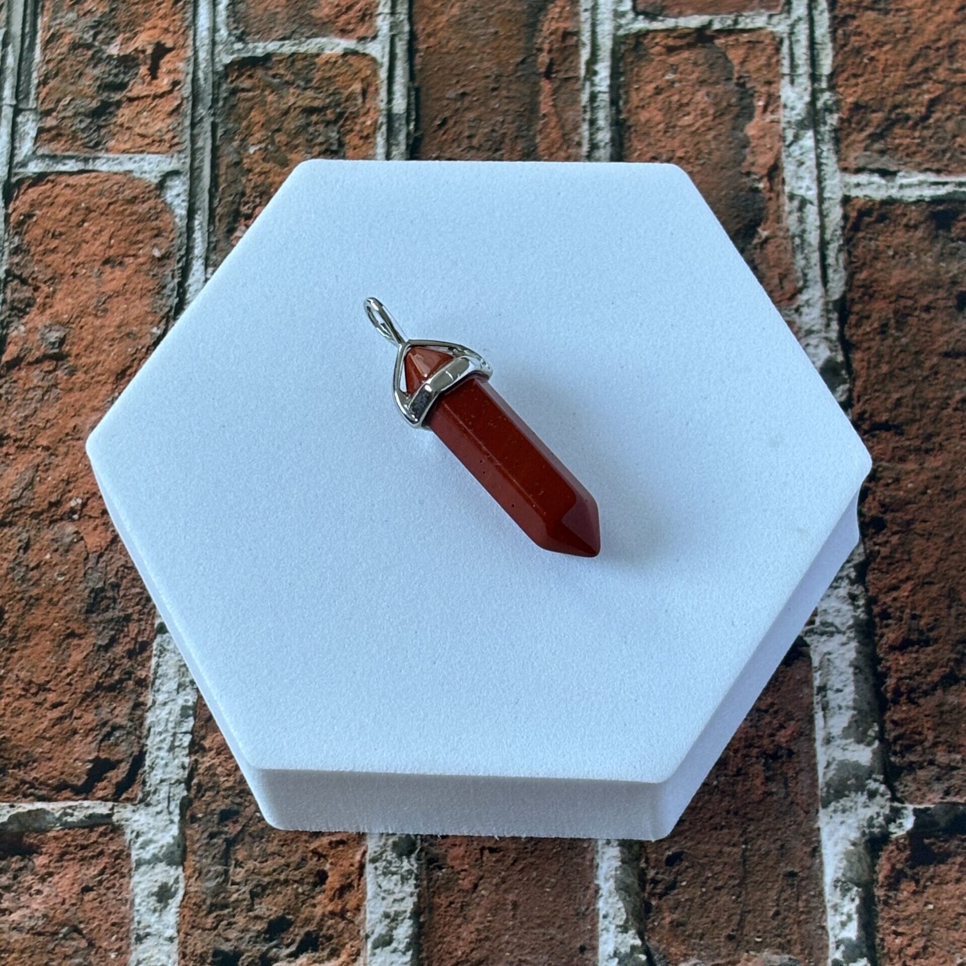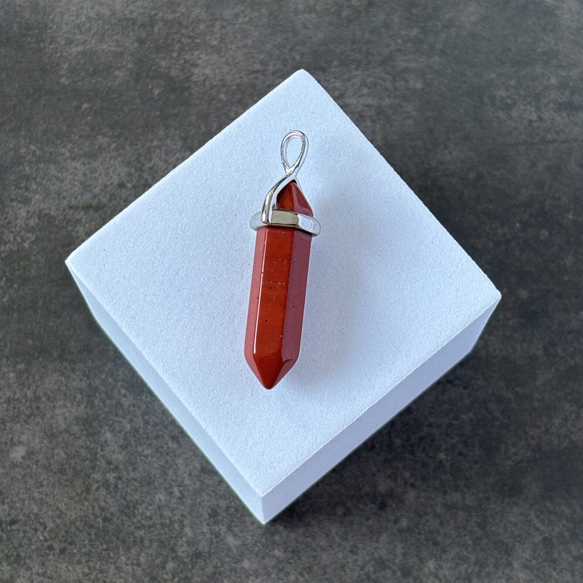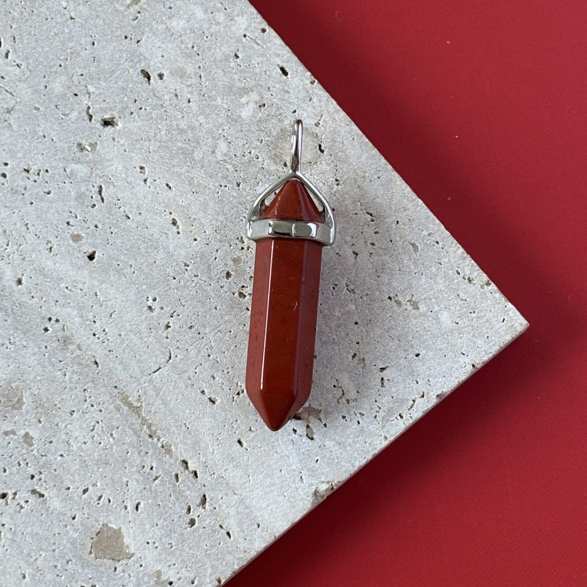 Pendentif jaspe rouge pointe -Pierre pointe de 3,5cm environ – Pierre naturelle qualité ‘AA’ – Bélière métal argenté.