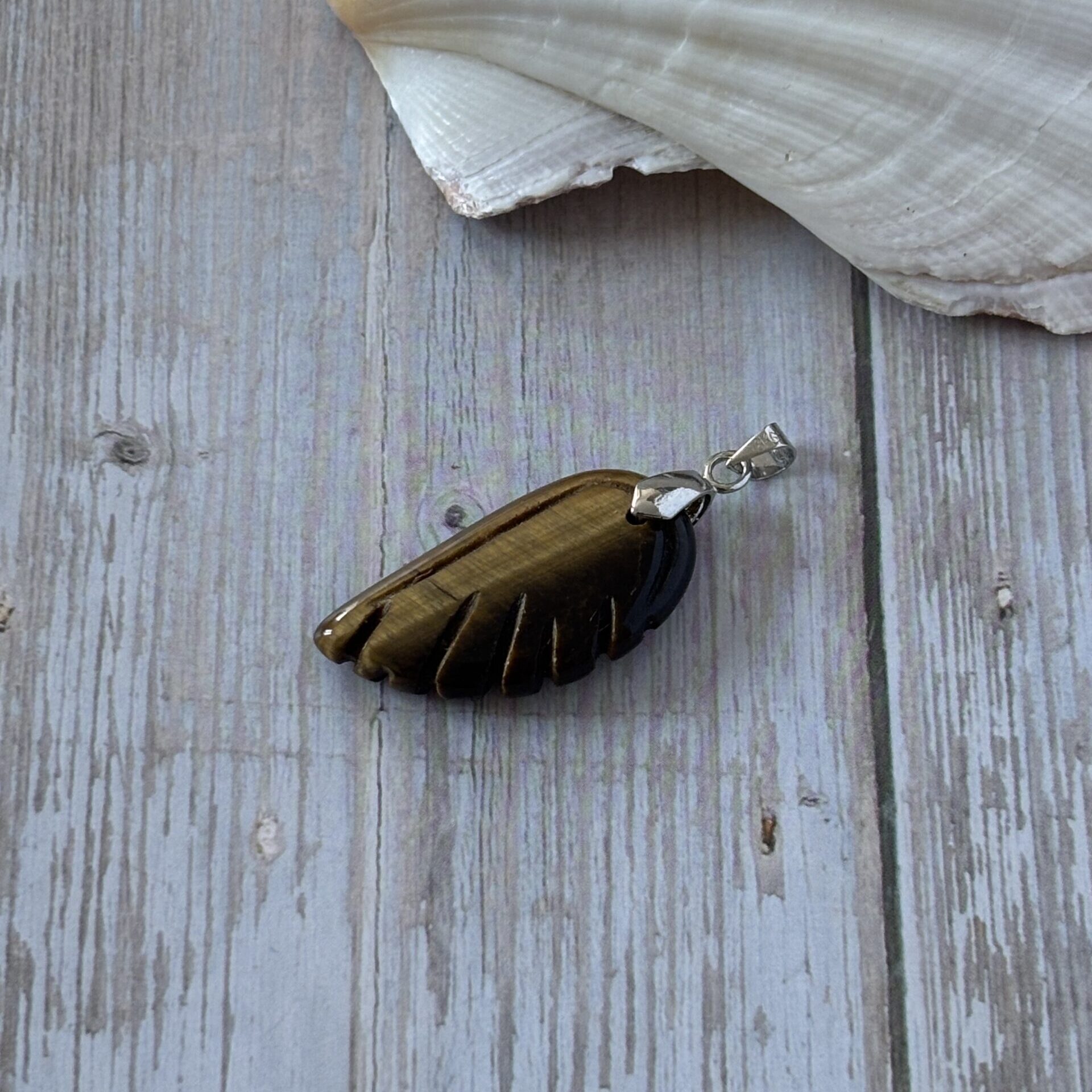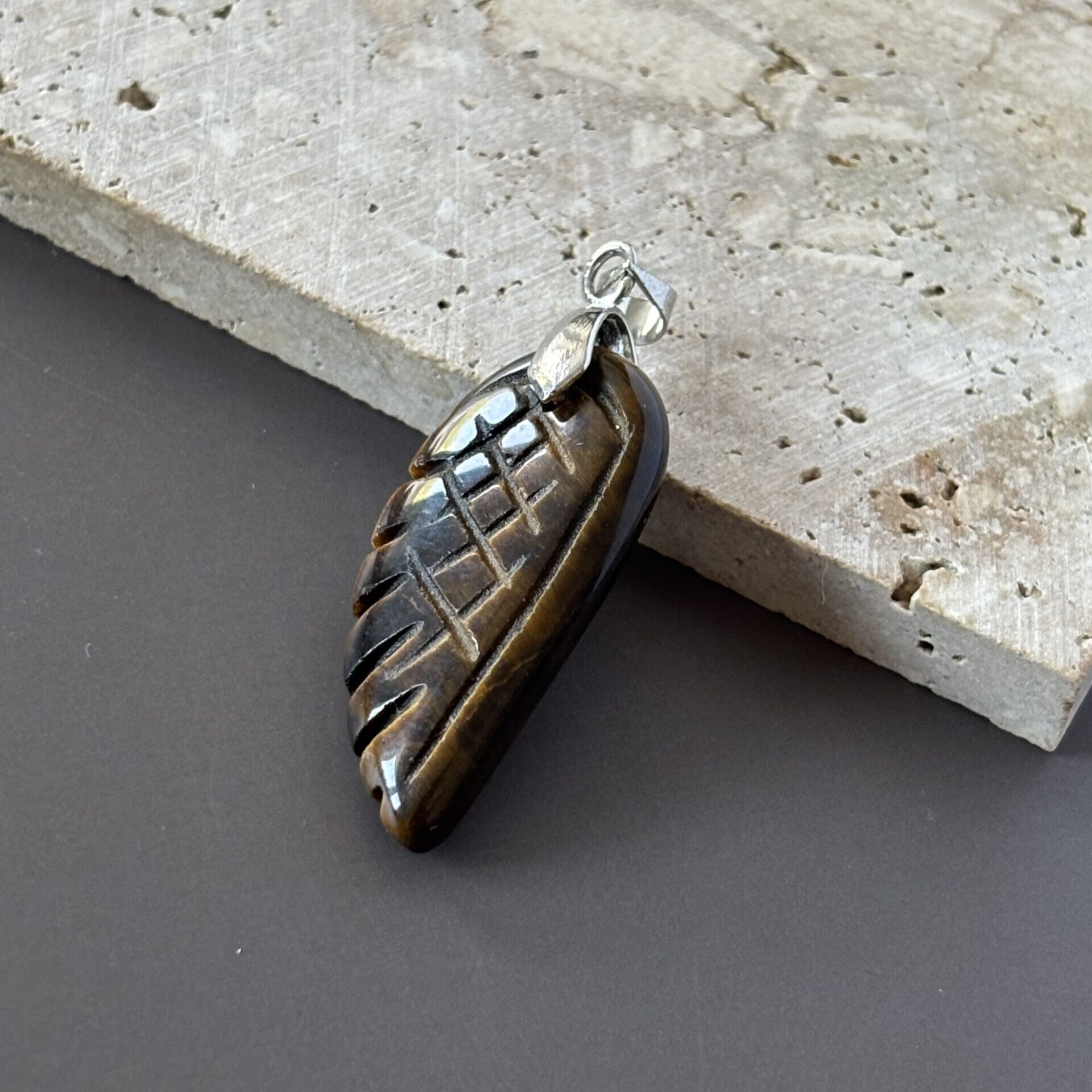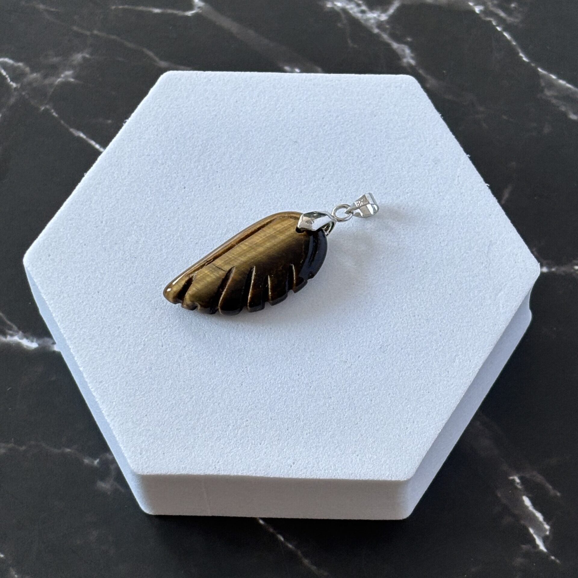 Pendentif œil de tigre forme aile d’ange – Dimension environ 3 cm – Bélière métal – Pierre naturelle qualité ‘AA’ .