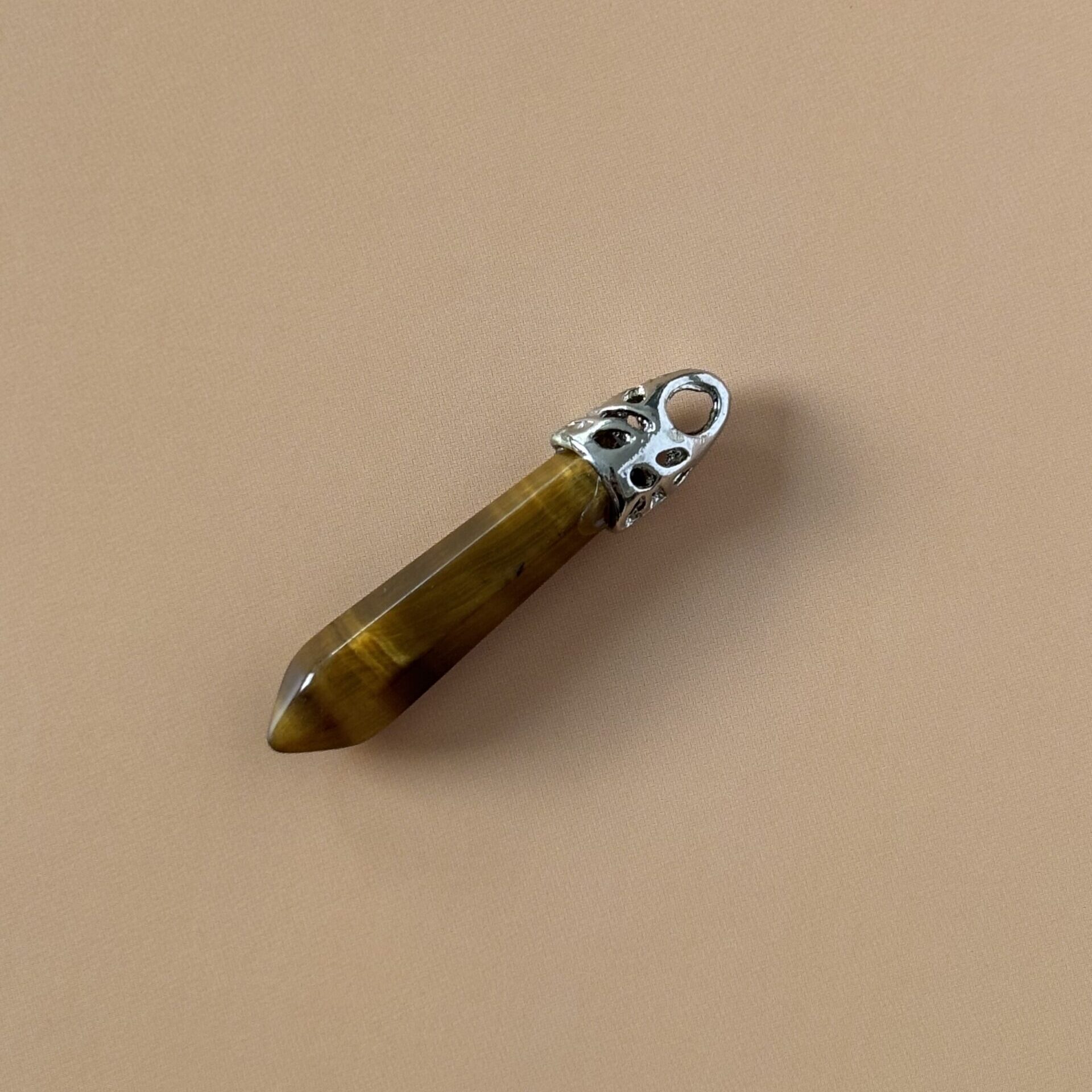 Pendentif œil de tigre pointe – Pierre pointe de 3,5cm environ – Pierre naturelle qualité ‘AA’ – Bélière métal argenté.