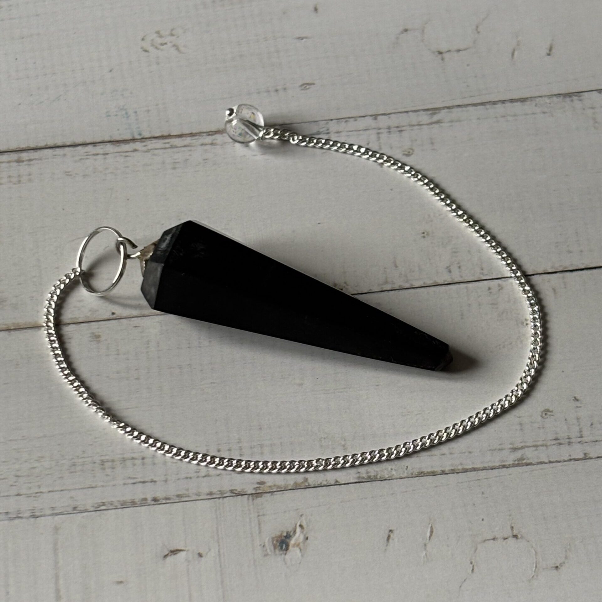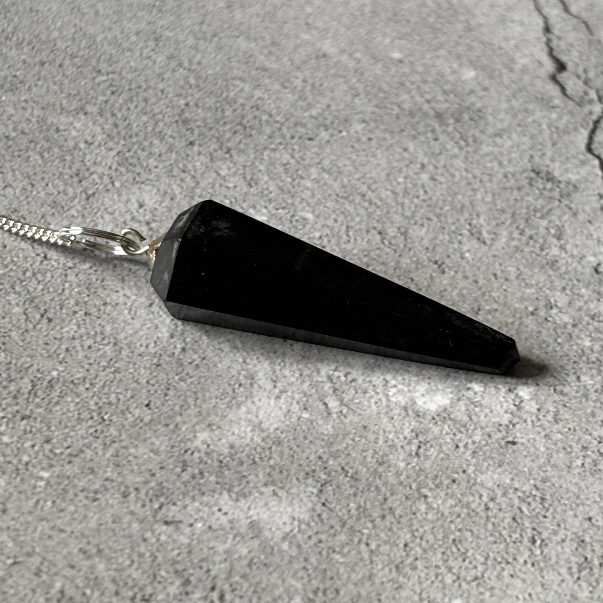 Shungite pendule à facettes – Longueur 4 cm environ – La chaînette et les accessoires sont en métal argenté – Vendu à l’unité