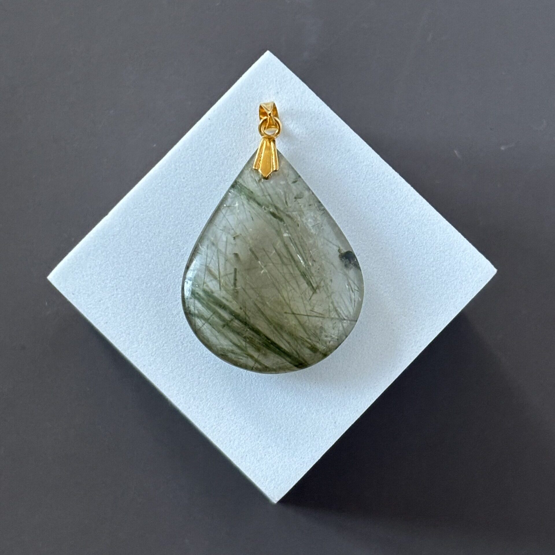 Pendentif quartz à inclusion d’actinote goutte – Bélière plaqué argent doré