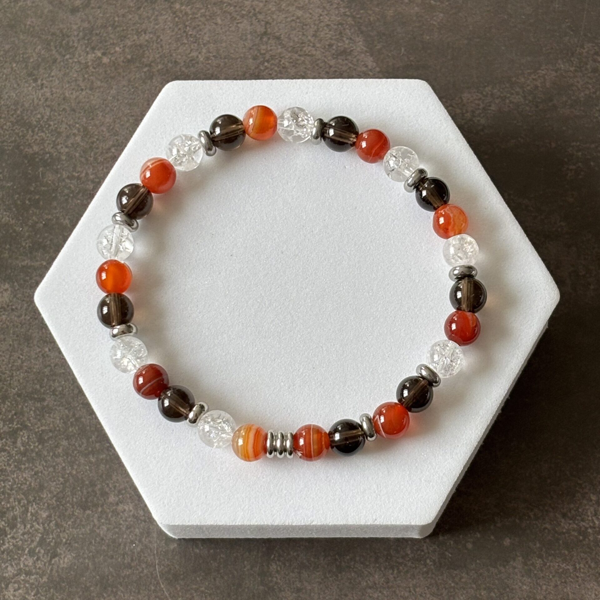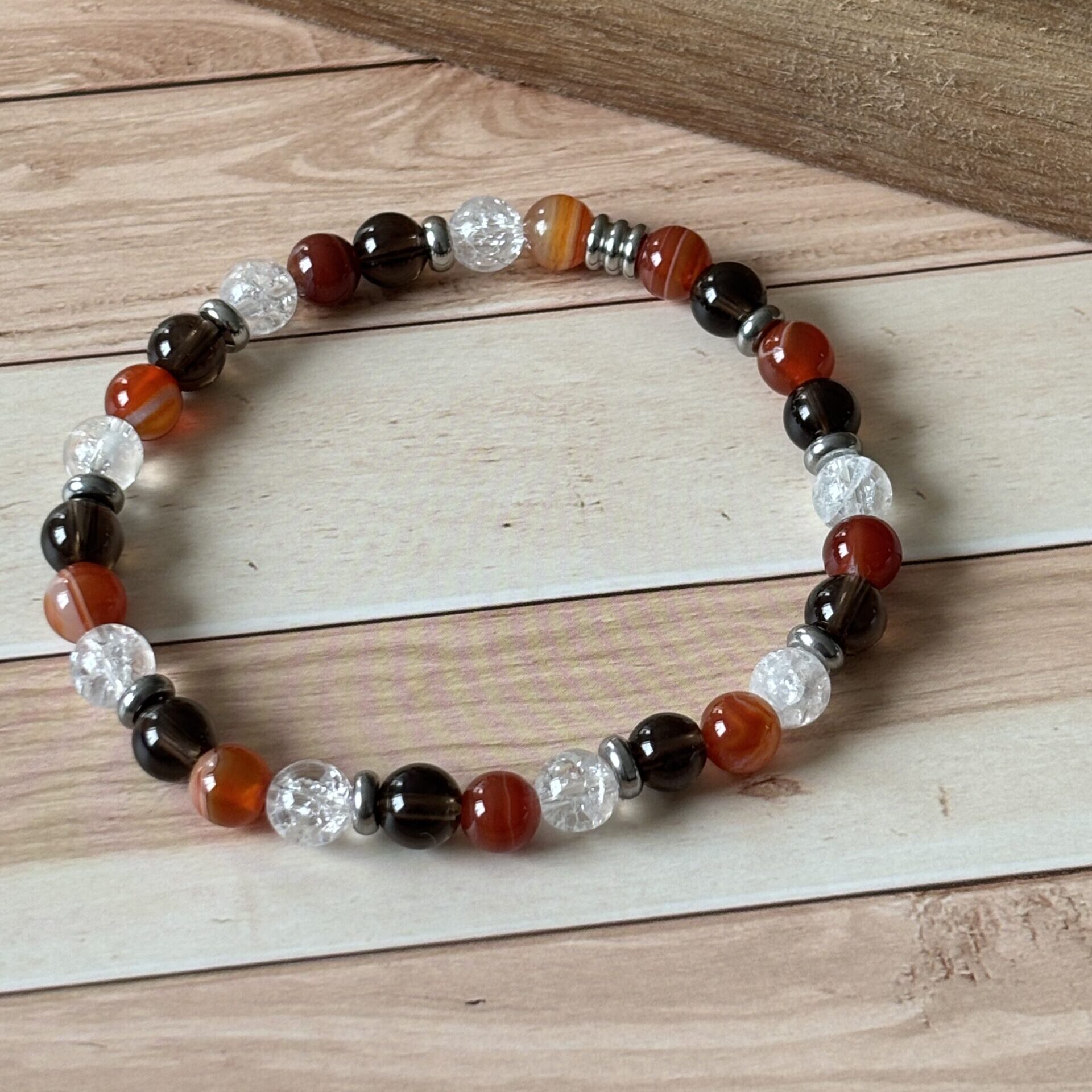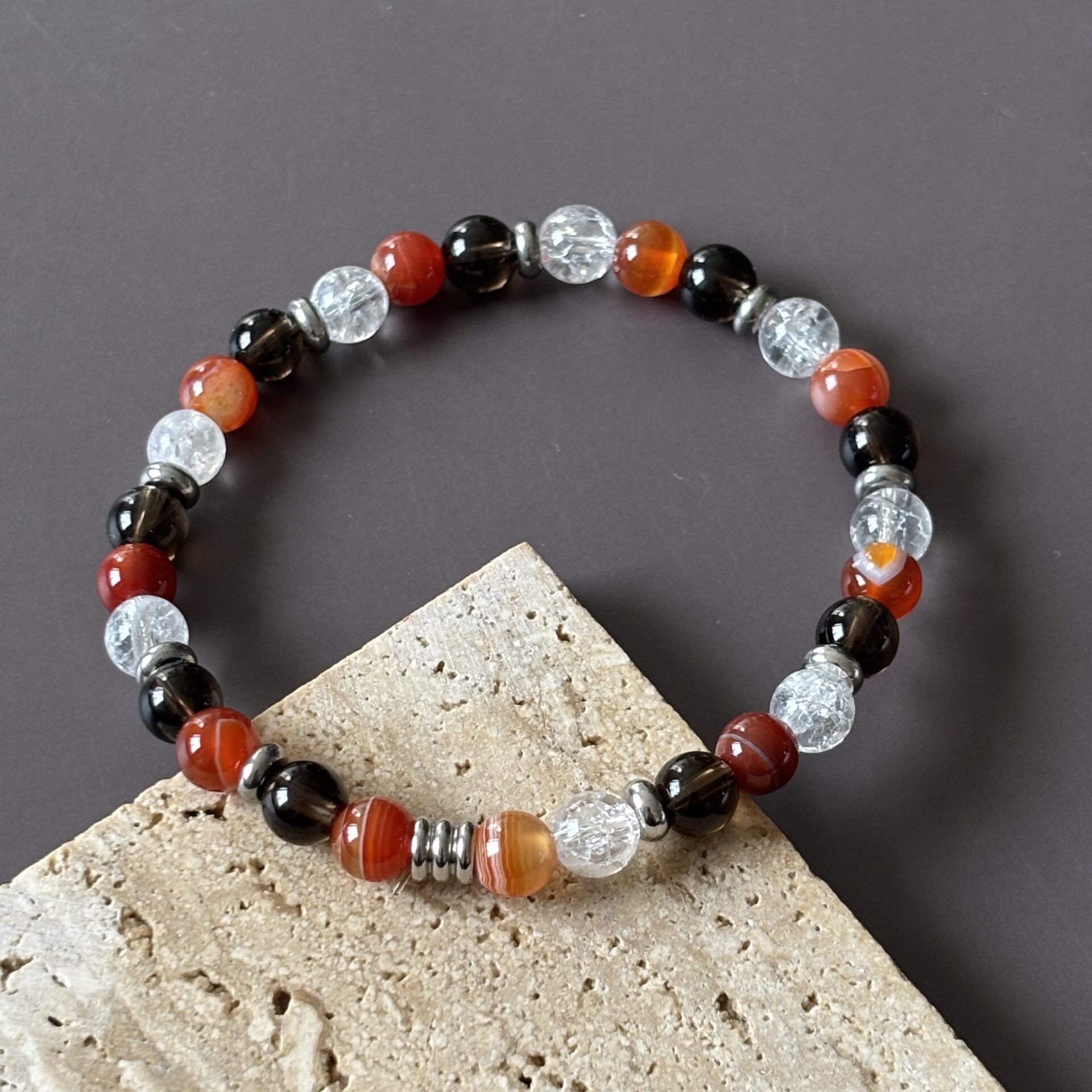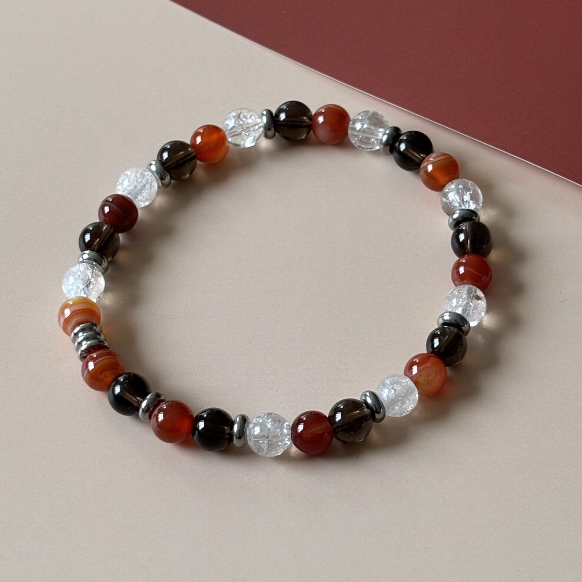 Ce bracelet, composé de quartz fumé, cornaline et cristal de roche, est un véritable allié pour équilibrer vos énergies, renforcer votre confiance en vous et favoriser votre bien-être physique et mental au quotidien.