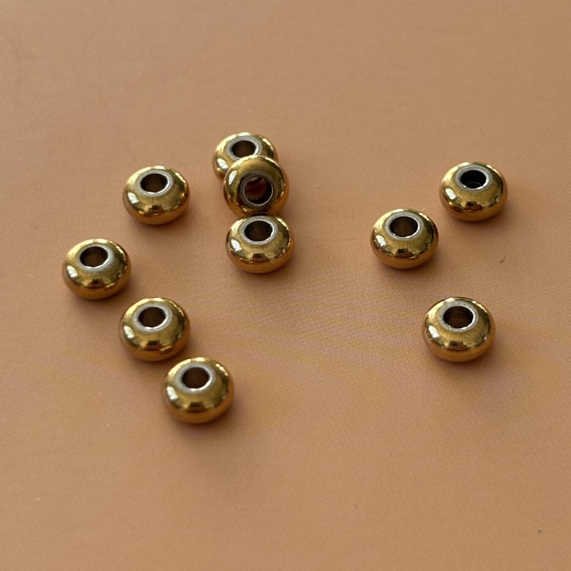 Rondelles acier inoxydable plaqué or à l’unité – Dimensions environ 6 x 3 mm et Trou d’environ 2 mm –