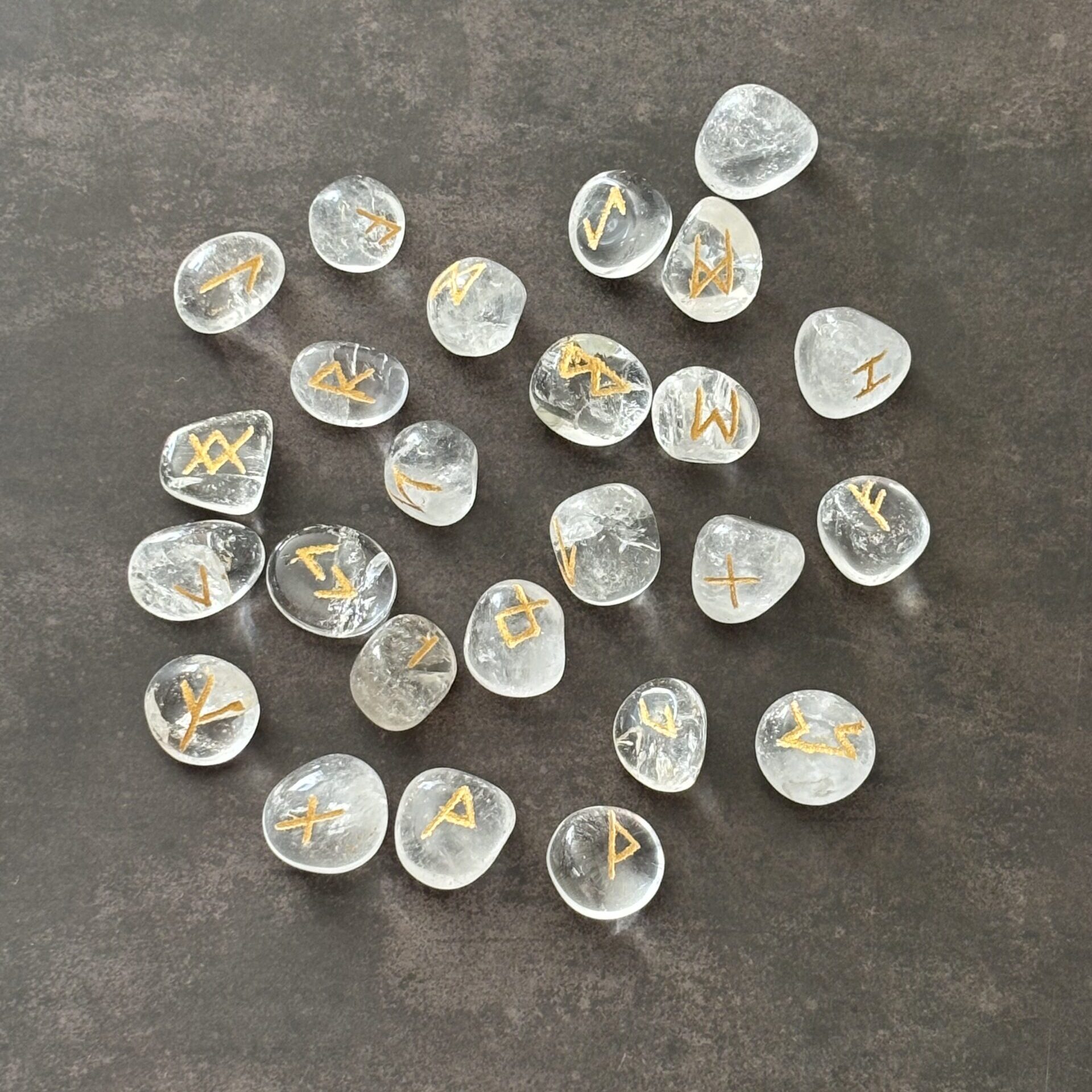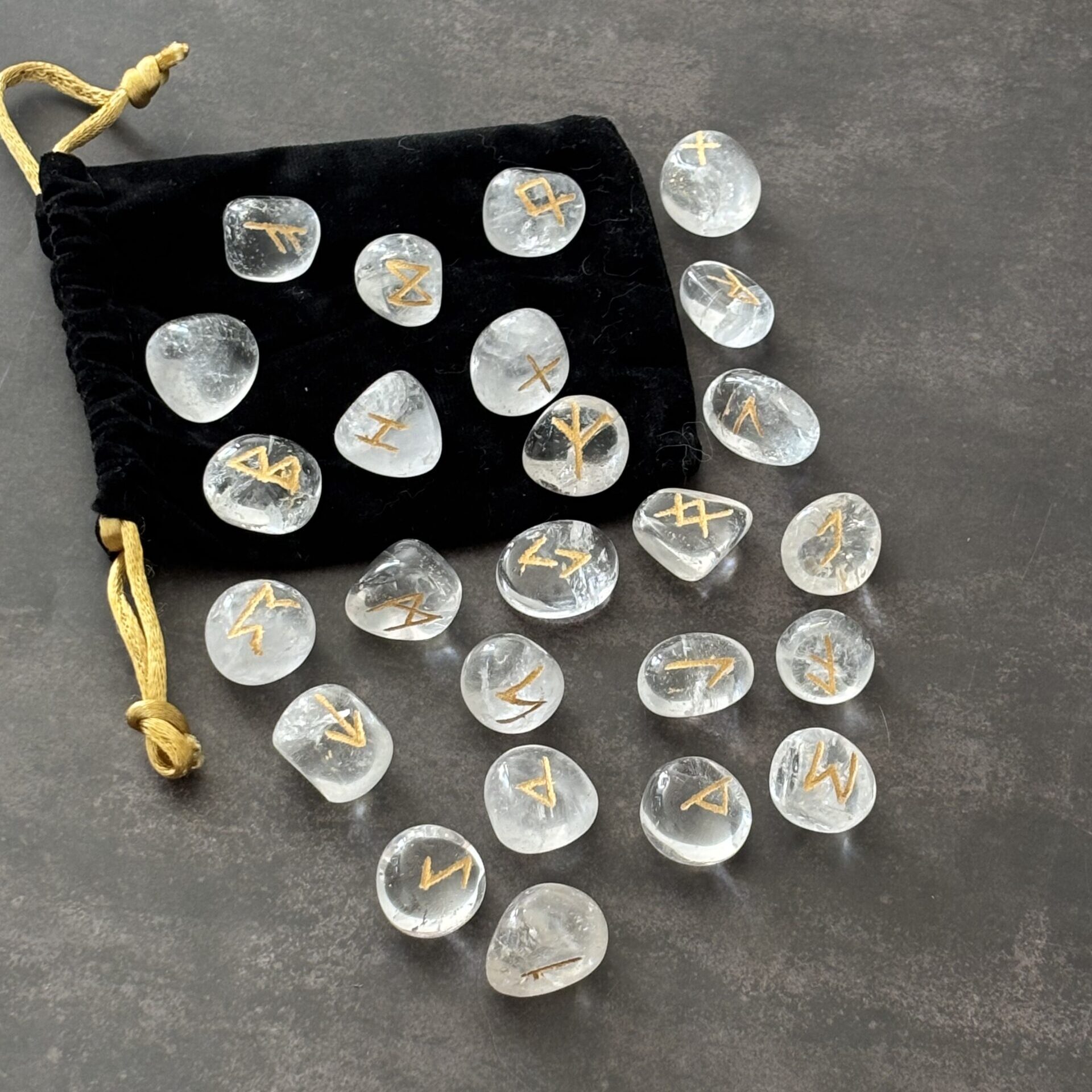 25 Runes dont 1 sans inscription en cristal de roche – Dimensions environs 1 à 2 cm